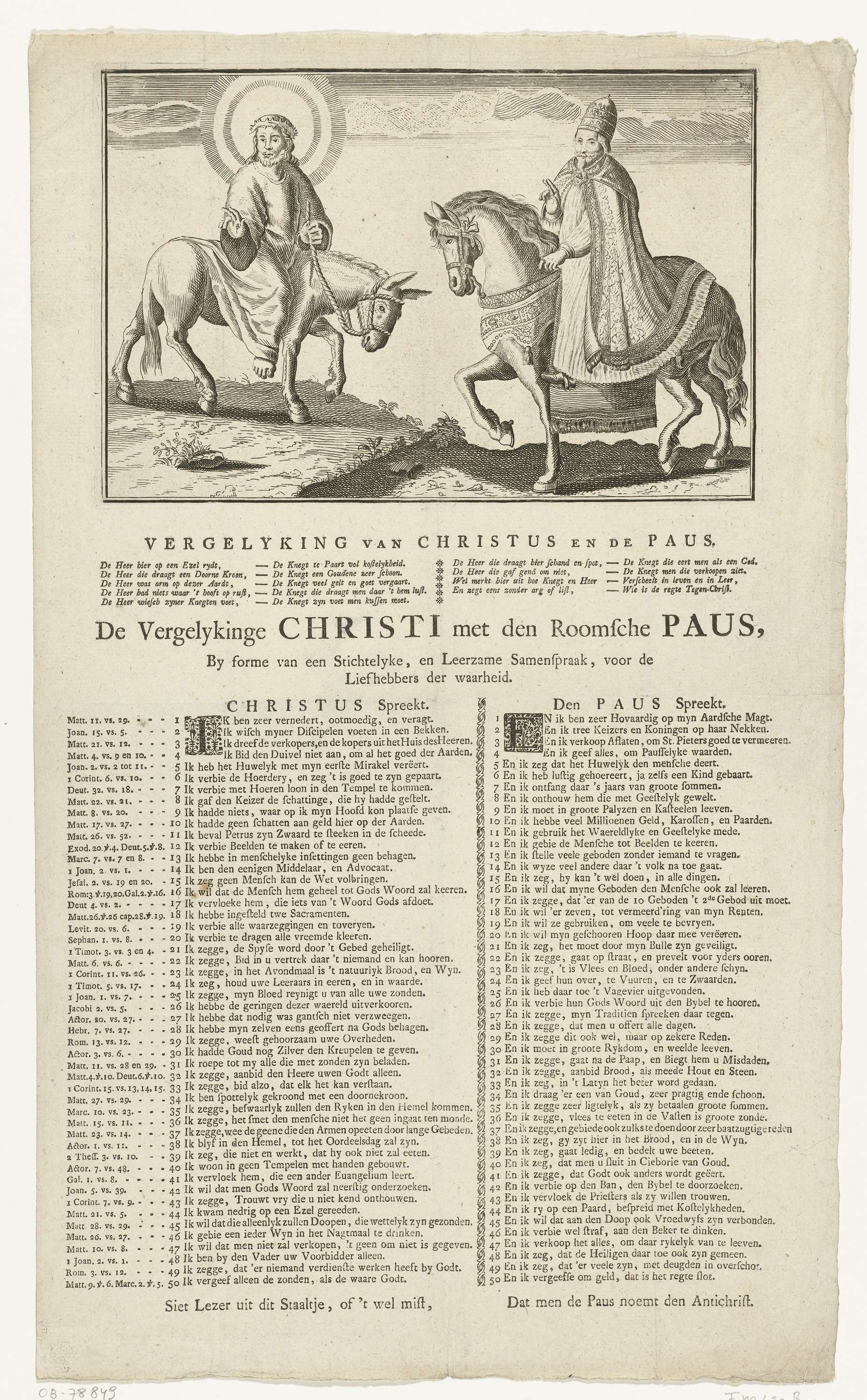 Christus op de ezel, de paus te paard. Vergelijking tussen de nederigheid van Christus en de hoogmoed van de paus. Met onderschriften onder de plaat van 2 keer 2 kolommen van 5 en 4 regels en van 50 genummerde verschillen tussen Christus en de paus in het Nederlands op het blad. Spotprent op de paus ...