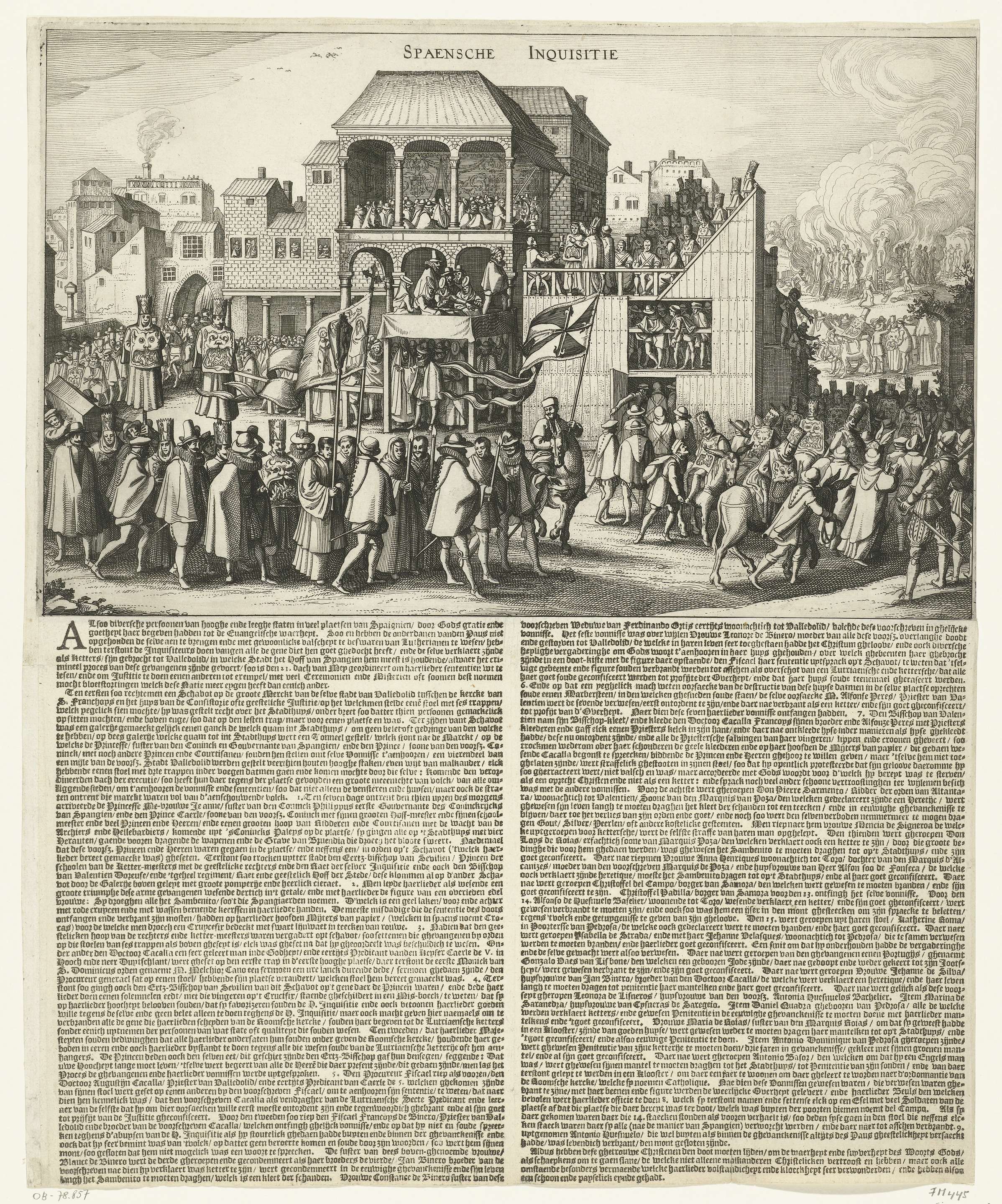 Auto-da-fe (autodafe) in Valladolid, 21 mei 1558. Processie van ca. dertig door de Spaanse Inquisitie ter dood veroordeelde protestanten naar een plaats buiten de stad waar ze op de brandstapel verbrand worden. In het midden een gebouw met hoogwaardigheidsbekleders, hiernaast een houten tribune waarop de ketters veroordeeld worden. De veroordeelden dragen speciale hoofddeksel (capirote) en ...