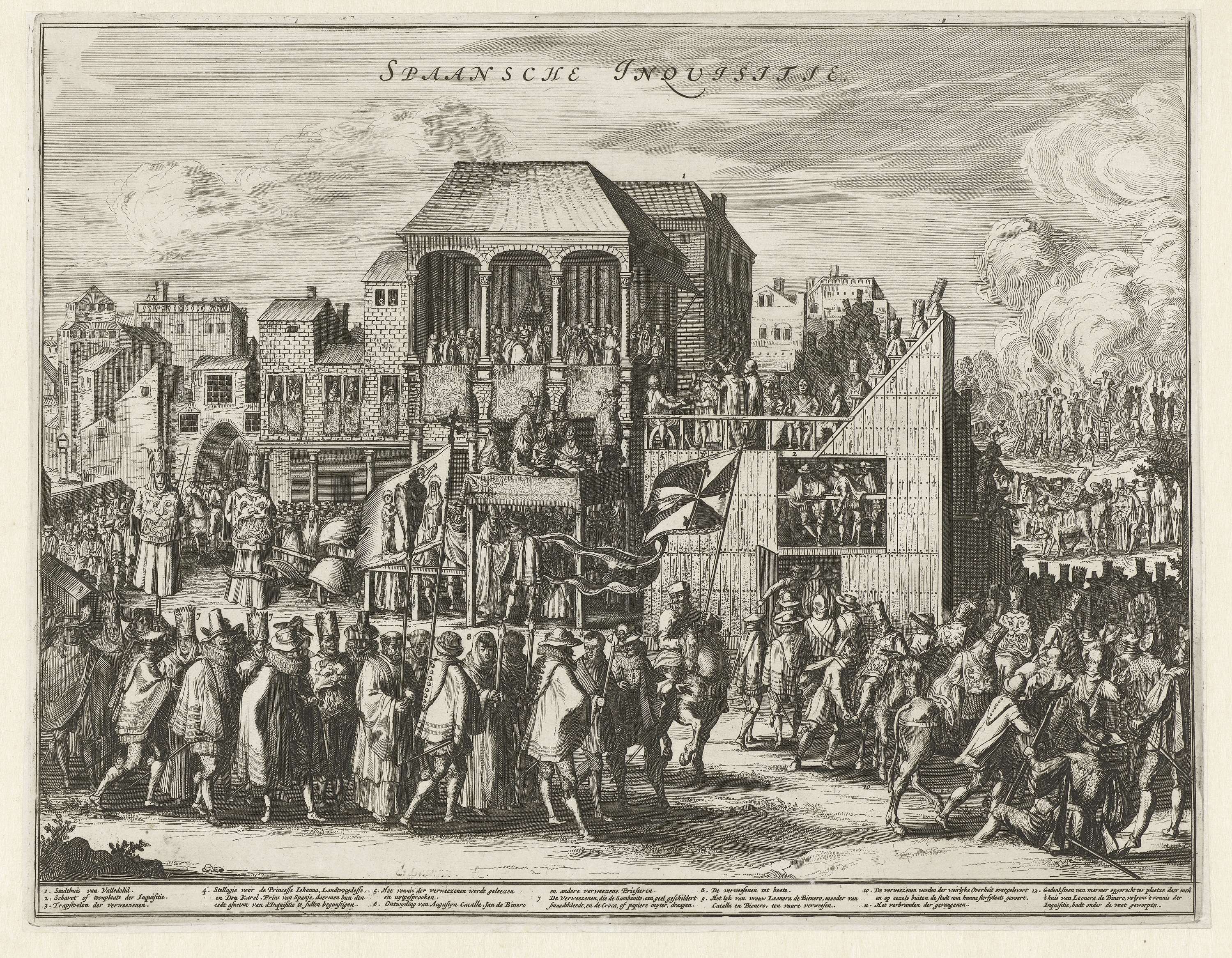 Auto-da-fe (autodafe) in Valladolid, 21 mei 1558. Processie van ca. dertig door de Spaanse Inquisitie ter dood veroordeelde protestanten naar een plaats buiten de stad waar ze op de brandstapel verbrand worden. In het midden een gebouw met hoogwaardigheidsbekleders, hiernaast een houten tribune waarop de ketters veroordeeld worden. De veroordeelden dragen speciale hoofddeksels en mantels ...
