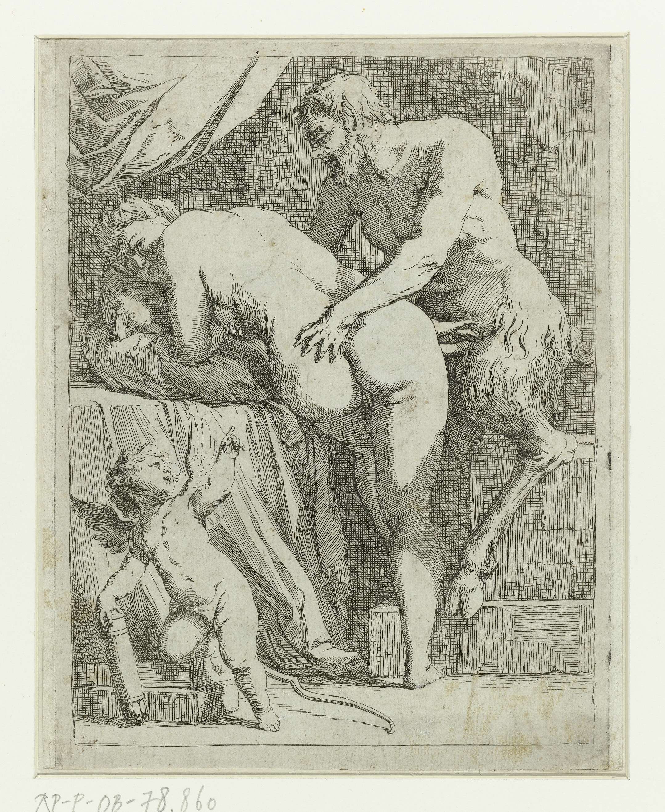 Erotische scene met naakte vrouw en sater die elkaar betasten. Links op de voorgrond Amor met pijlenkoker en boog.