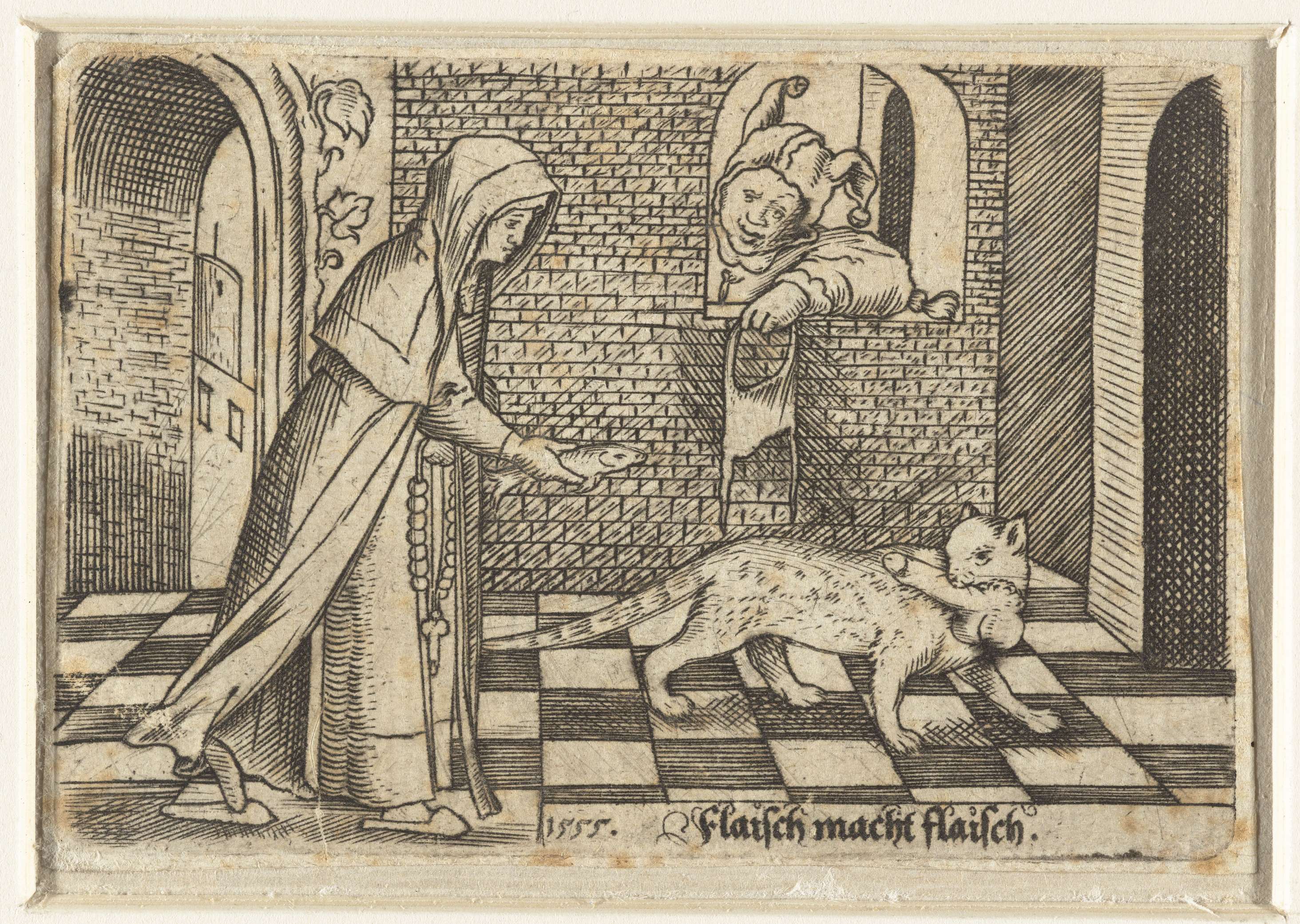 Non loopt met vis in de hand een kat achterna, zij wil de vis ruilen met een penis die de kat in de bek heeft. Een nar kijkt toe door een raamkozijn.