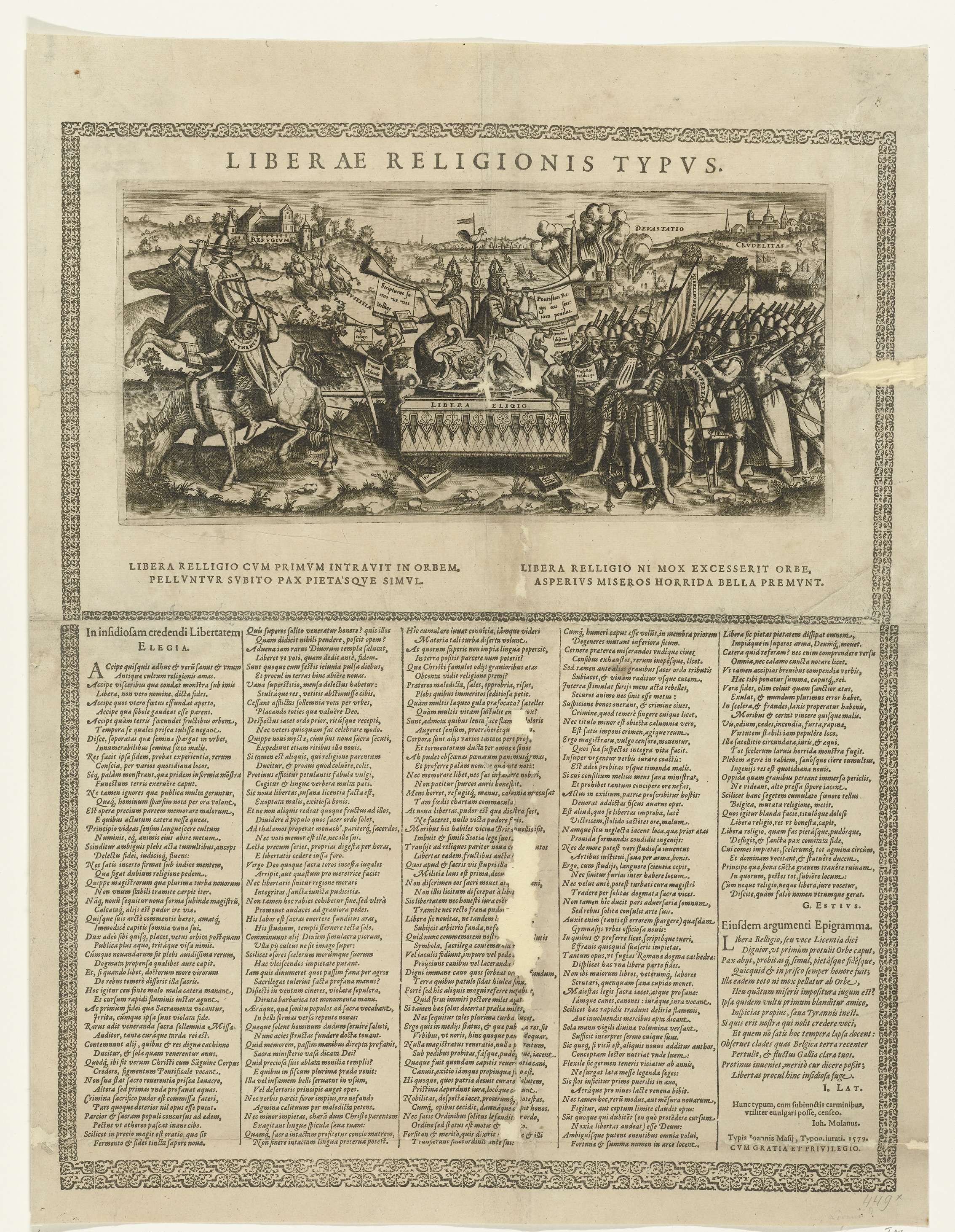 Strijdwagen van de godsdienstvrijheid, 1579. De voorstelling hekelt de hervorming. De strijdwagen wordt getrokken door twee paarden bereden door Calvijn en Luther. Op de wapen twee vrouwen met geschriften en bazuinen en vier duiveltjes. In het gevolg van de wagen een bende soldaten met vaandels met de personificaties van Opstand en Ketterij en een bedelaar ...