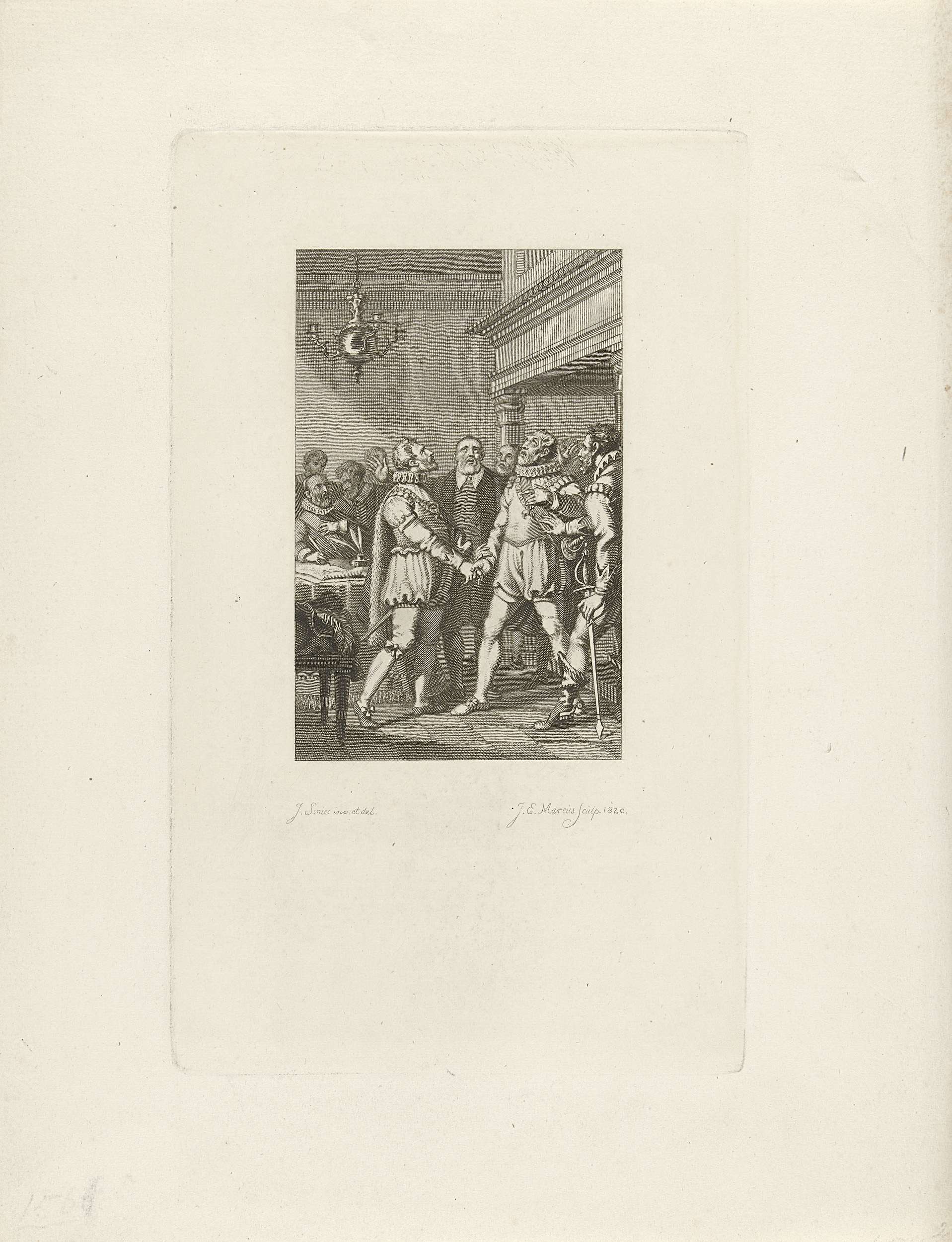Verbond der Edelen, 1566. Twee edelen van de orde van het Gulden Vlies geven elkaar de hand, op de achtergrond wordt een document opgesteld.