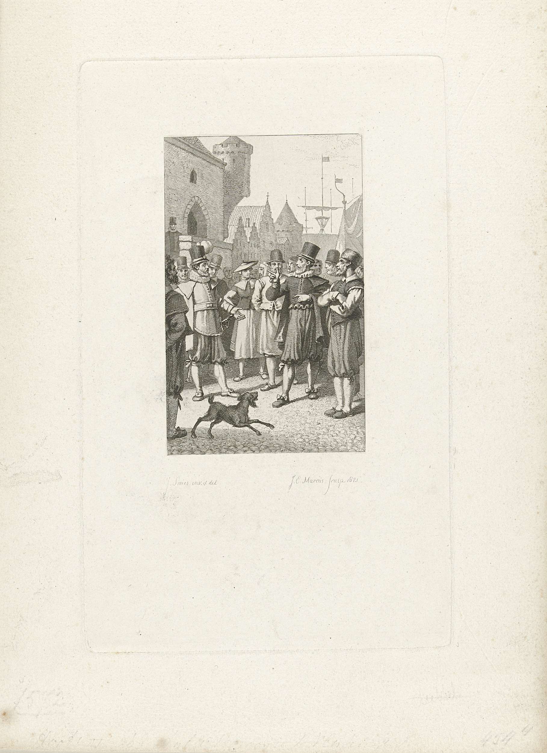 Ant. van Bourgondië te Vlissingen, 5 april 1572. Een aantal mannen in overleg met elkaar. Wellicht betreft het hier het verhaal over de weddenschap die een man aangaat om voor een paar kannen bier vanaf de wallen van de stad een kanon op de Spaanse vloot af te schieten.