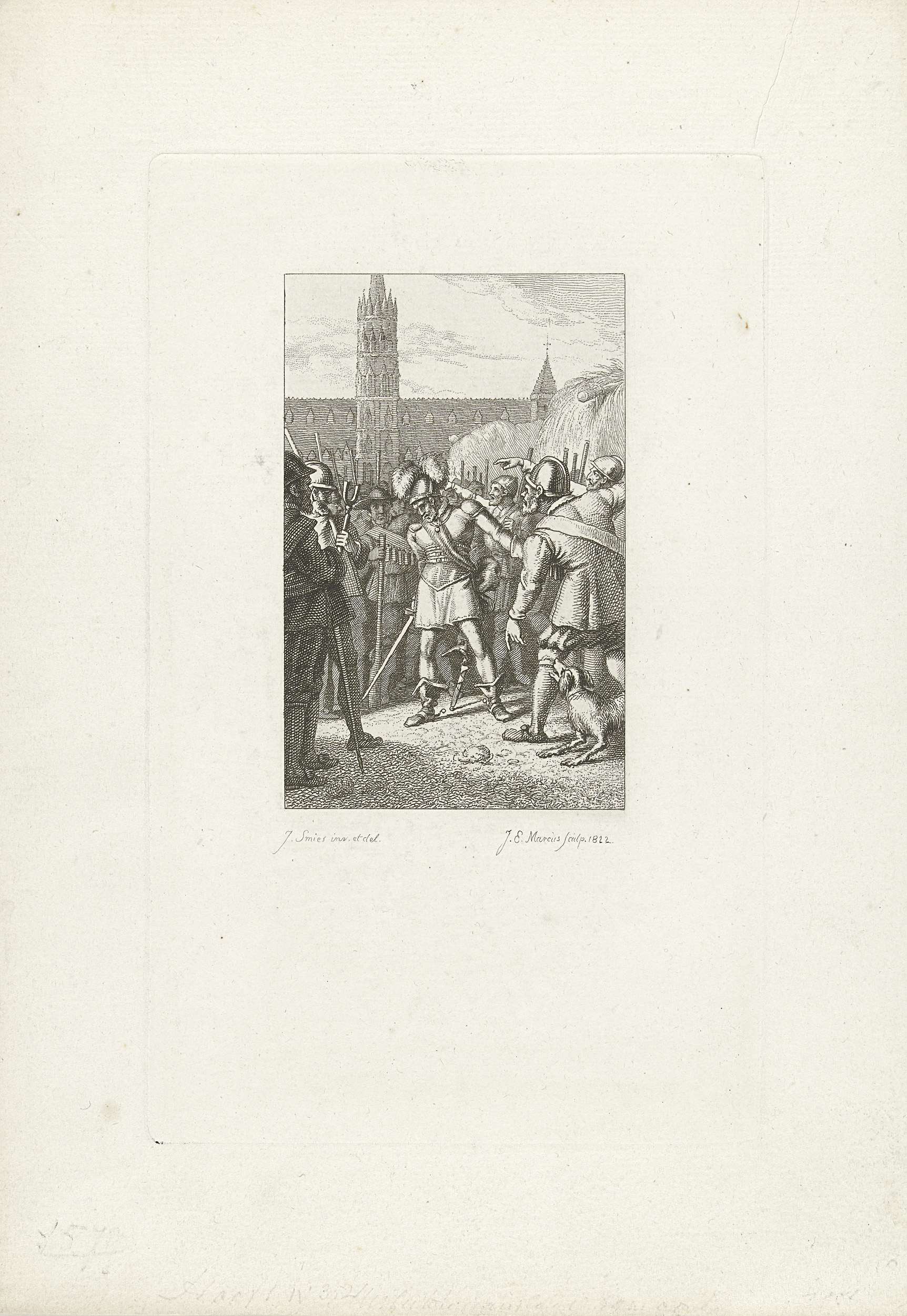 Mislukte aanslag op Brussel door Filips van Egmond, 1579. Groep soldaten en boeren houden de graaf gevangen op de Grote Markt en wijzen hem op de plaats voor het stadhuis waar zijn vader Lamoraal onthoofd werd.