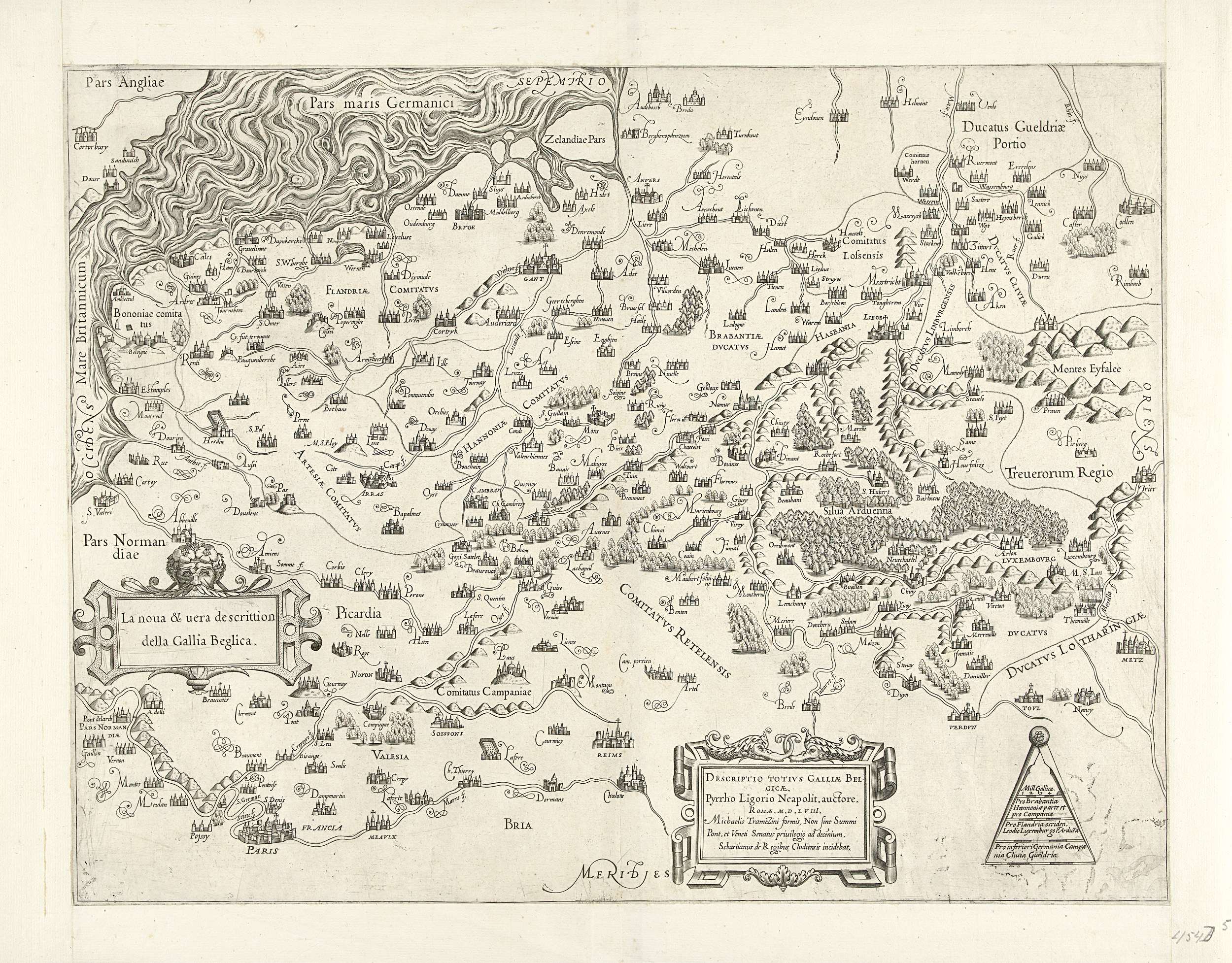 Kaart van België en Noord-Frankrijk. Met twee cartouches met een opschrift en de titel. Rechtsonder een passer met de schaal. Alle opschriften in het Latijn.