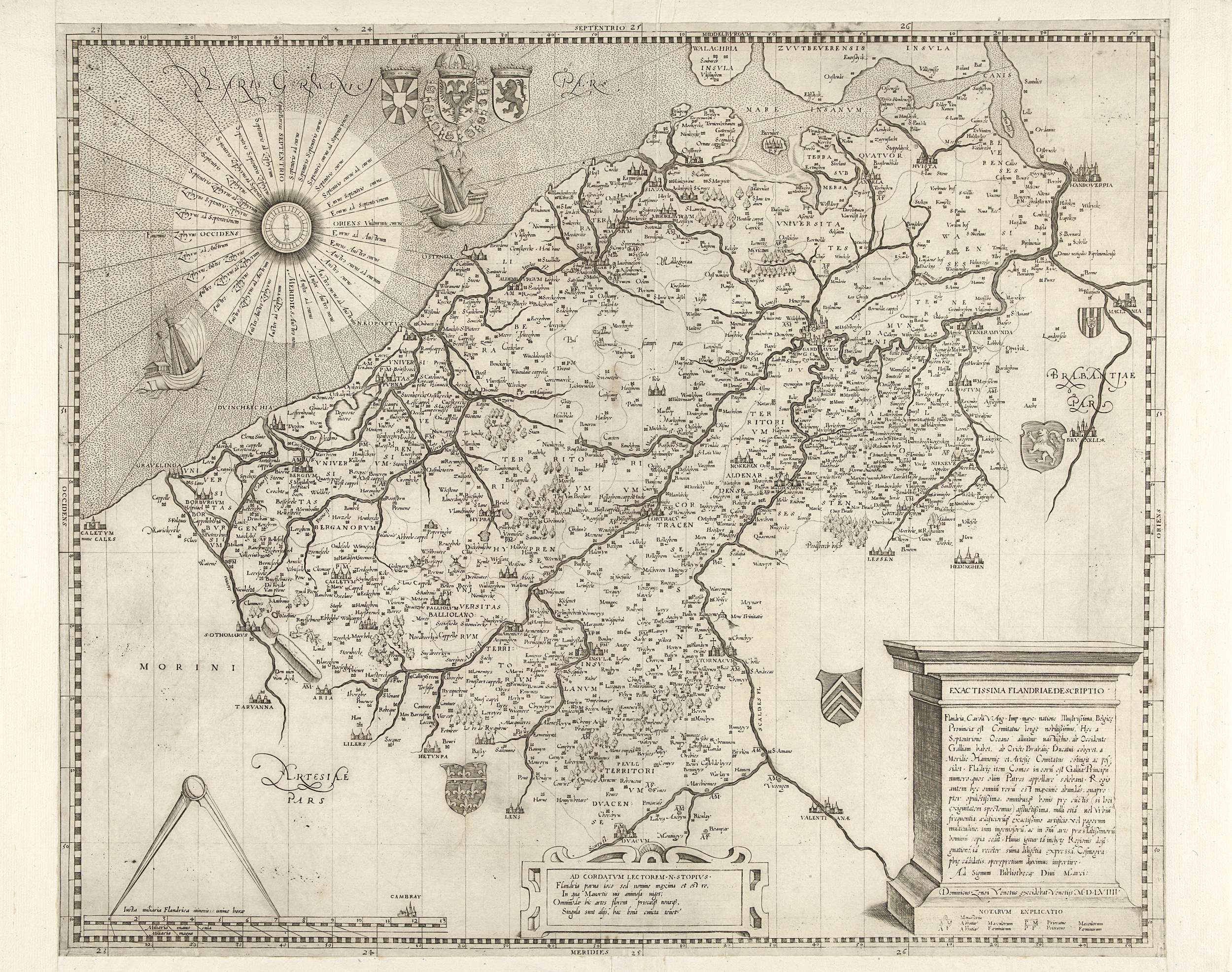 Kaart van Vlaanderen. Onderaan twee cartouches met de titel en een opschrift aan de lezer, linksonder de passer met schalen. Linksboven een windroos. Alle opschriften in het Latijn.