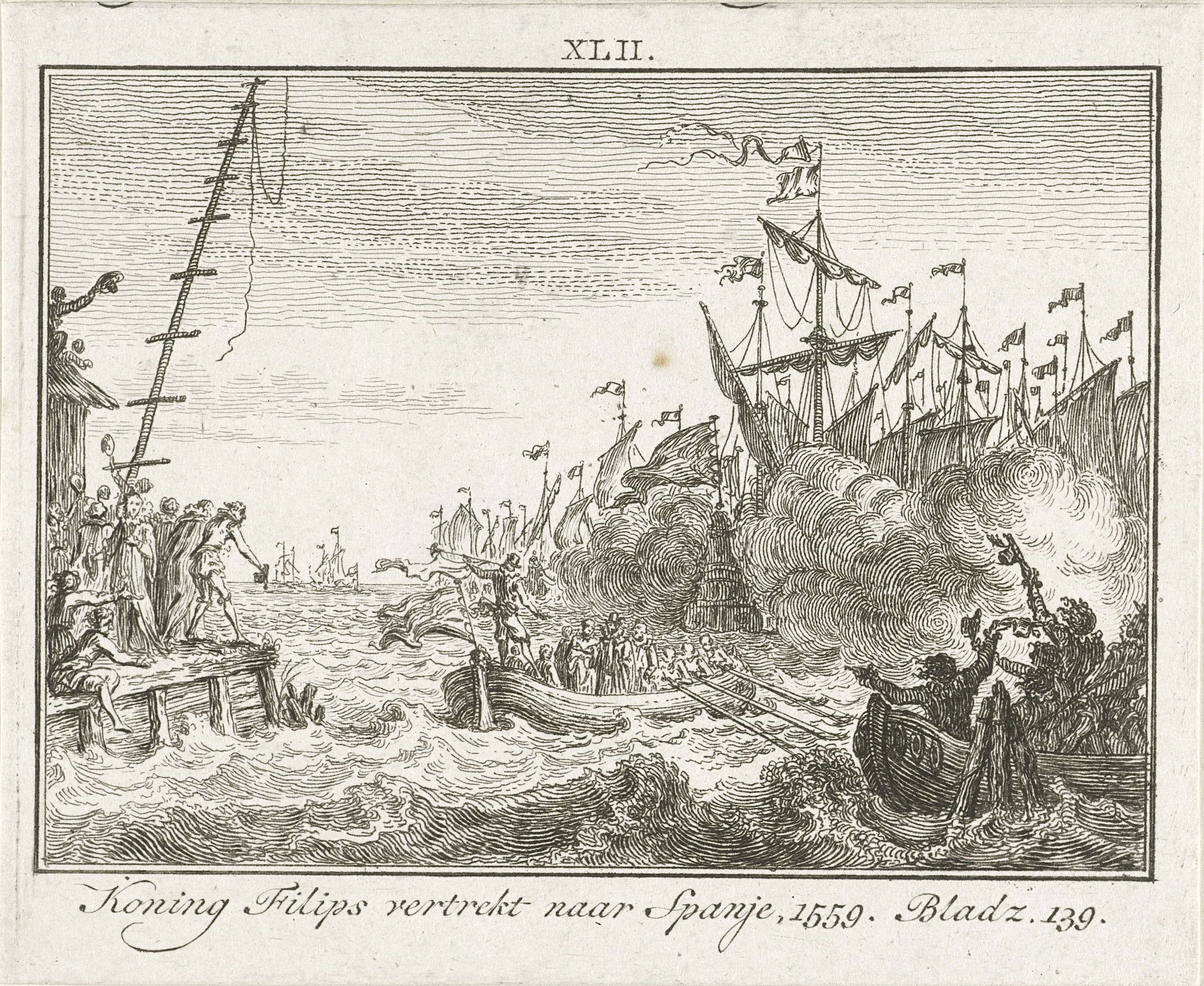 Koning Filips II vertrekt per schip naar Spanje, 1559. De koning wordt vanaf de kade in een sloep naar de vloot geroeid.