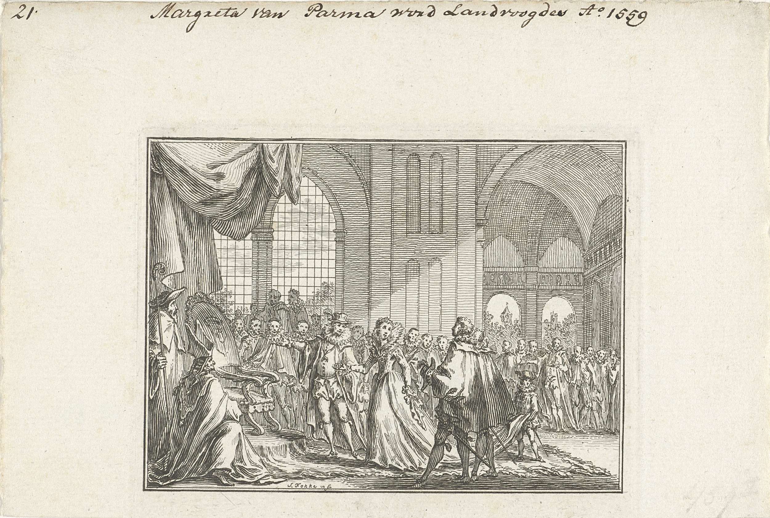 Margaretha van Parma wordt landvoogdes, 1559. Intereir waarin de hertogin naar de lege stoel wordt geleid.