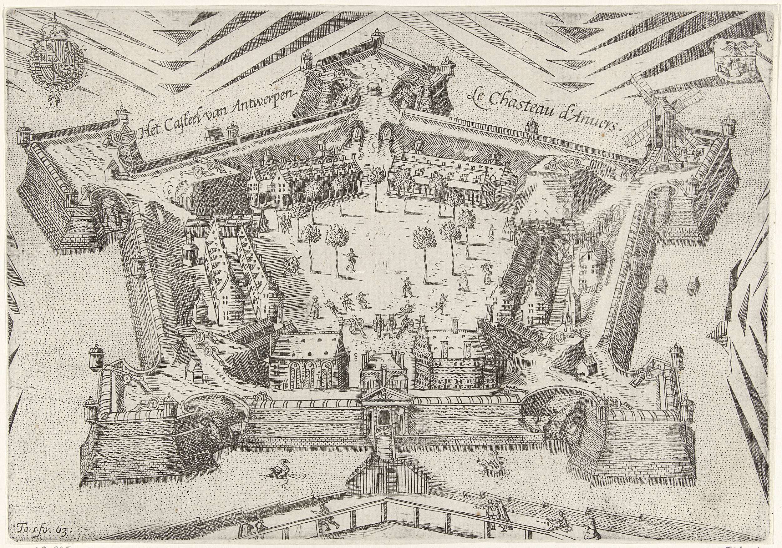 De Citadel van Antwerpen, van boven gezien, ca. 1570. Het standbeeld van Alva centraal op de binnenplaats is gedeeltelijk uit de koperplaat gepolijst, maar nog herkenbaar. Bovenaan de wapens van Filips II en de stad Antwerpen.