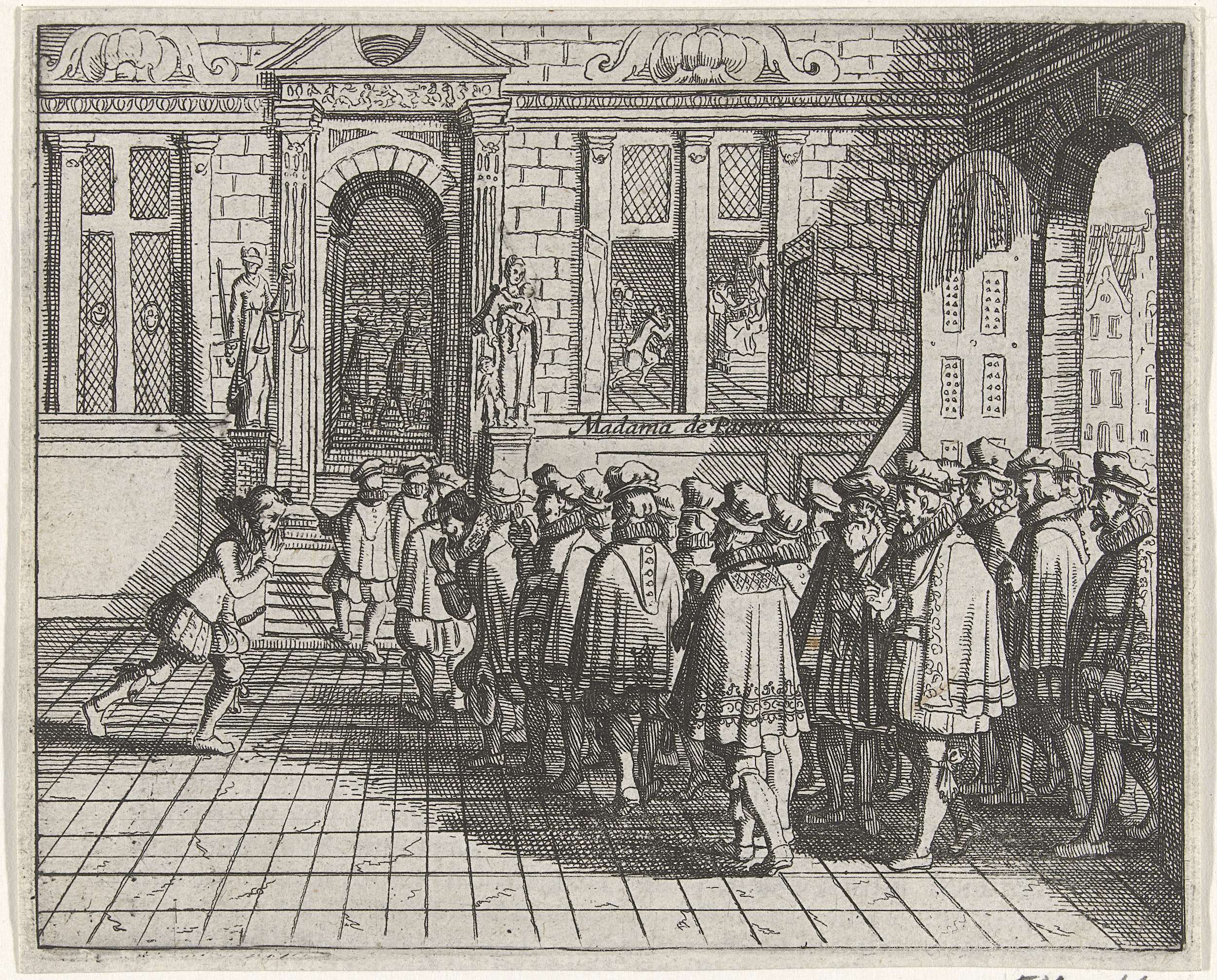 Het aanbieden van het Smeekschrift door het verbond der edelen aan de landvoogdes, de hertogin van Parma, te Brussel 5 april 1566. Op de achterzijde bedrukt.