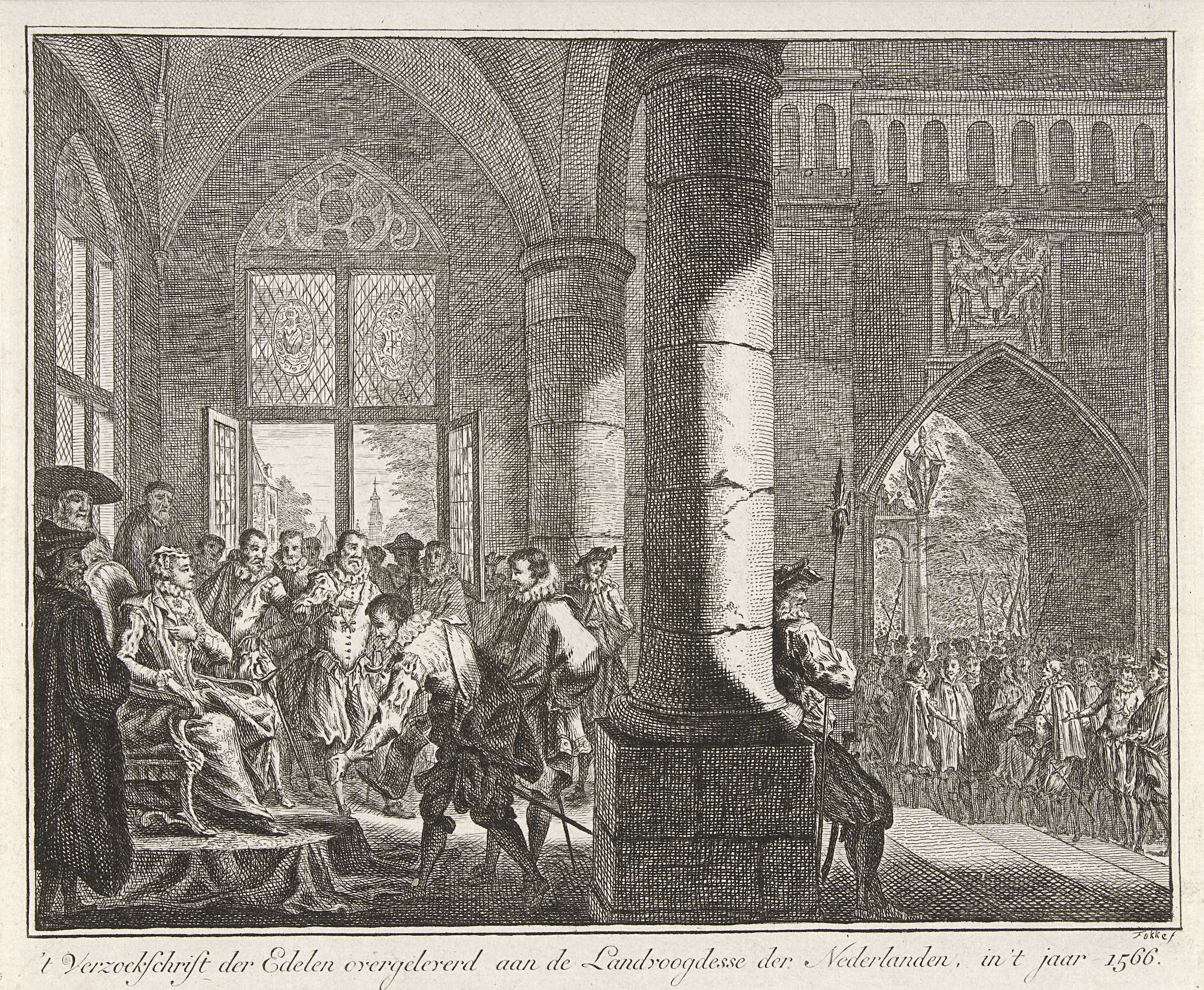 Het aanbieden van het Smeekschrift door het verbond der edelen aan de landvoogdes, de hertogin van Parma, in het paleis te Brussel 5 april 1566.