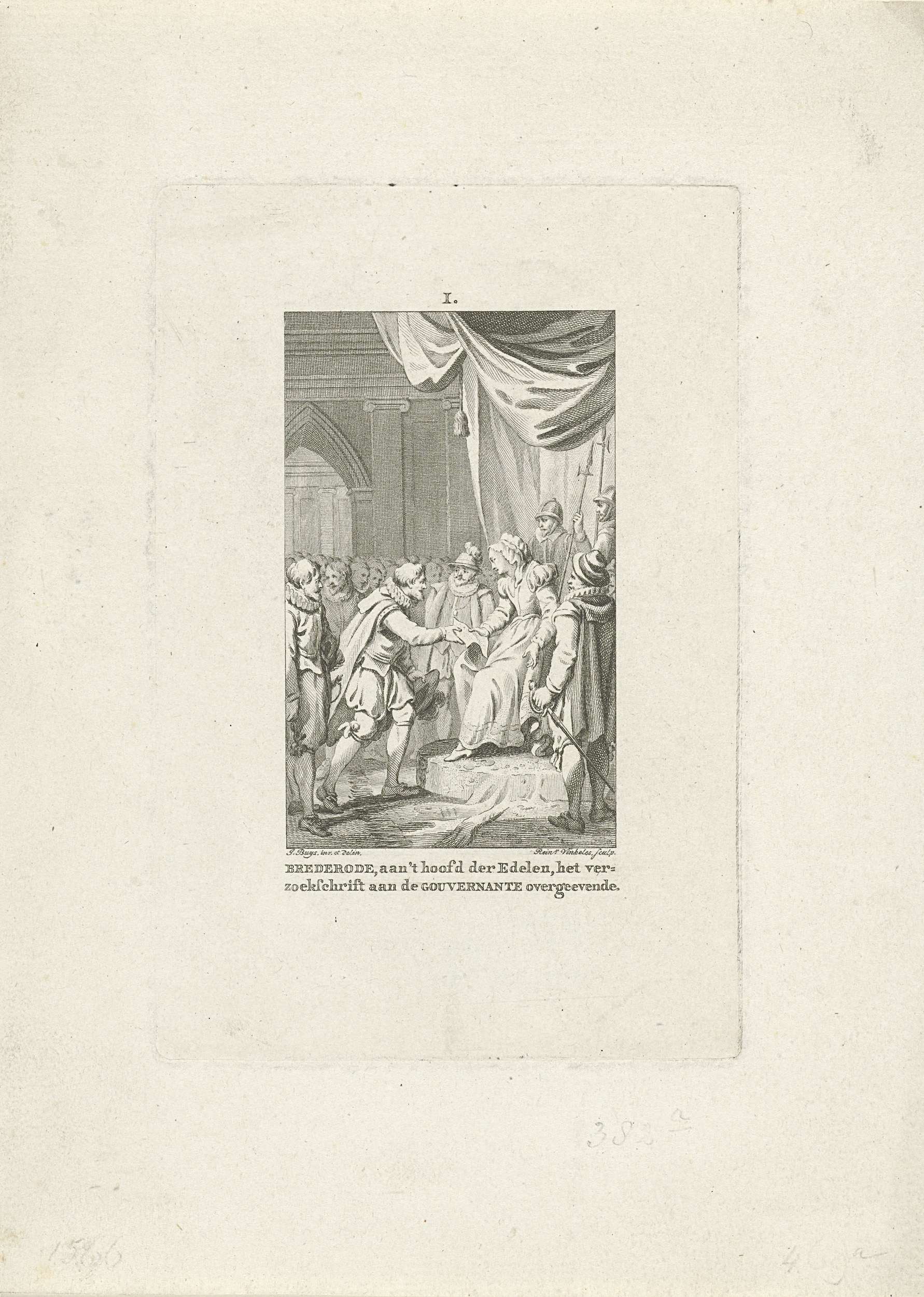 Het aanbieden van het Smeekschrift door het verbond der edelen aan de landvoogdes, de hertogin van Parma, in het paleis te Brussel 5 april 1566. Hendrik van Brederode overhandigt haar het verzoekschrift.