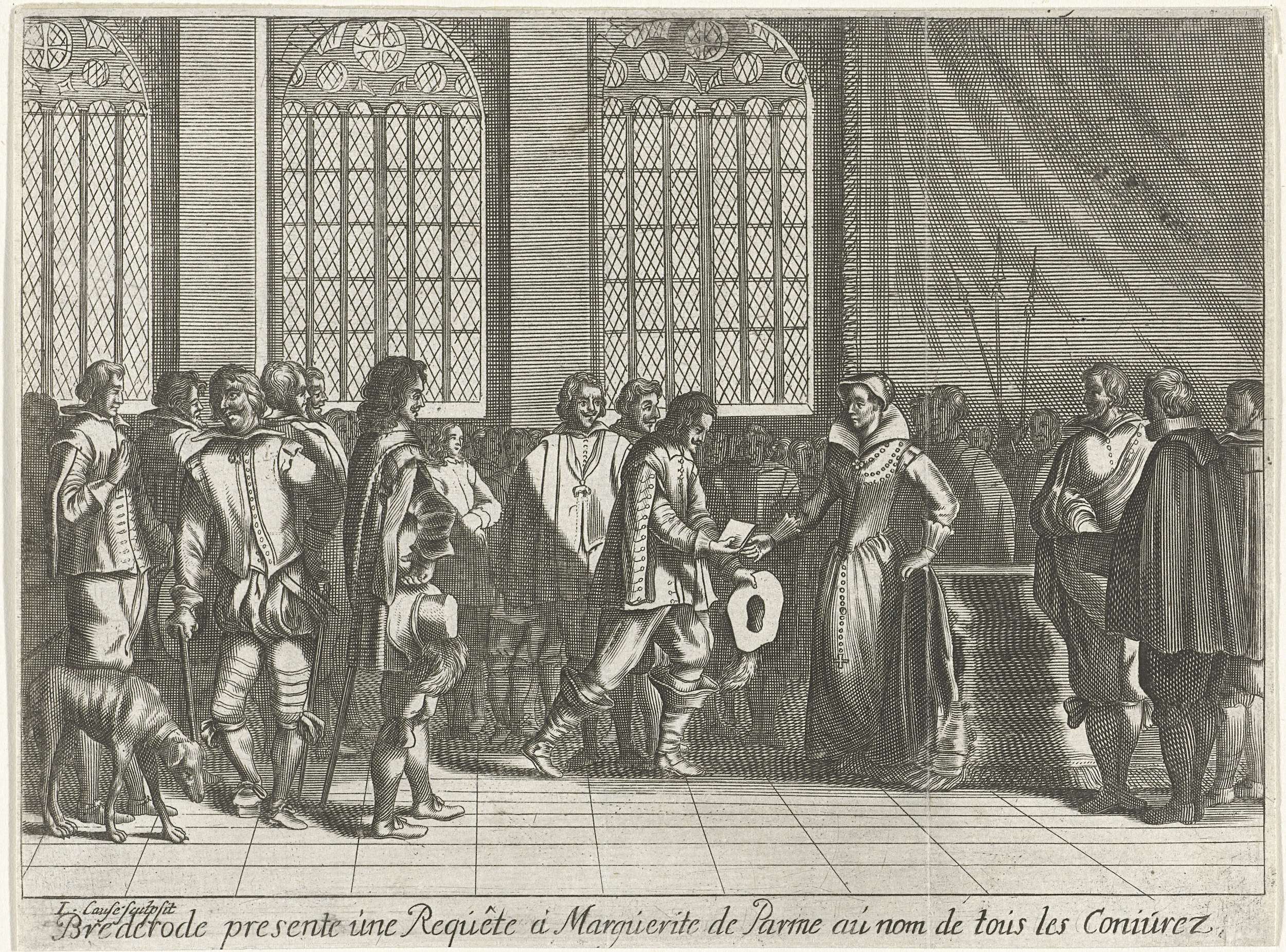 Het aanbieden van het Smeekschrift door het verbond der edelen aan de landvoogdes, de hertogin van Parma, in het paleis te Brussel 5 april 1566. Hendrik van Brederode overhandigt haar het verzoekschrift.