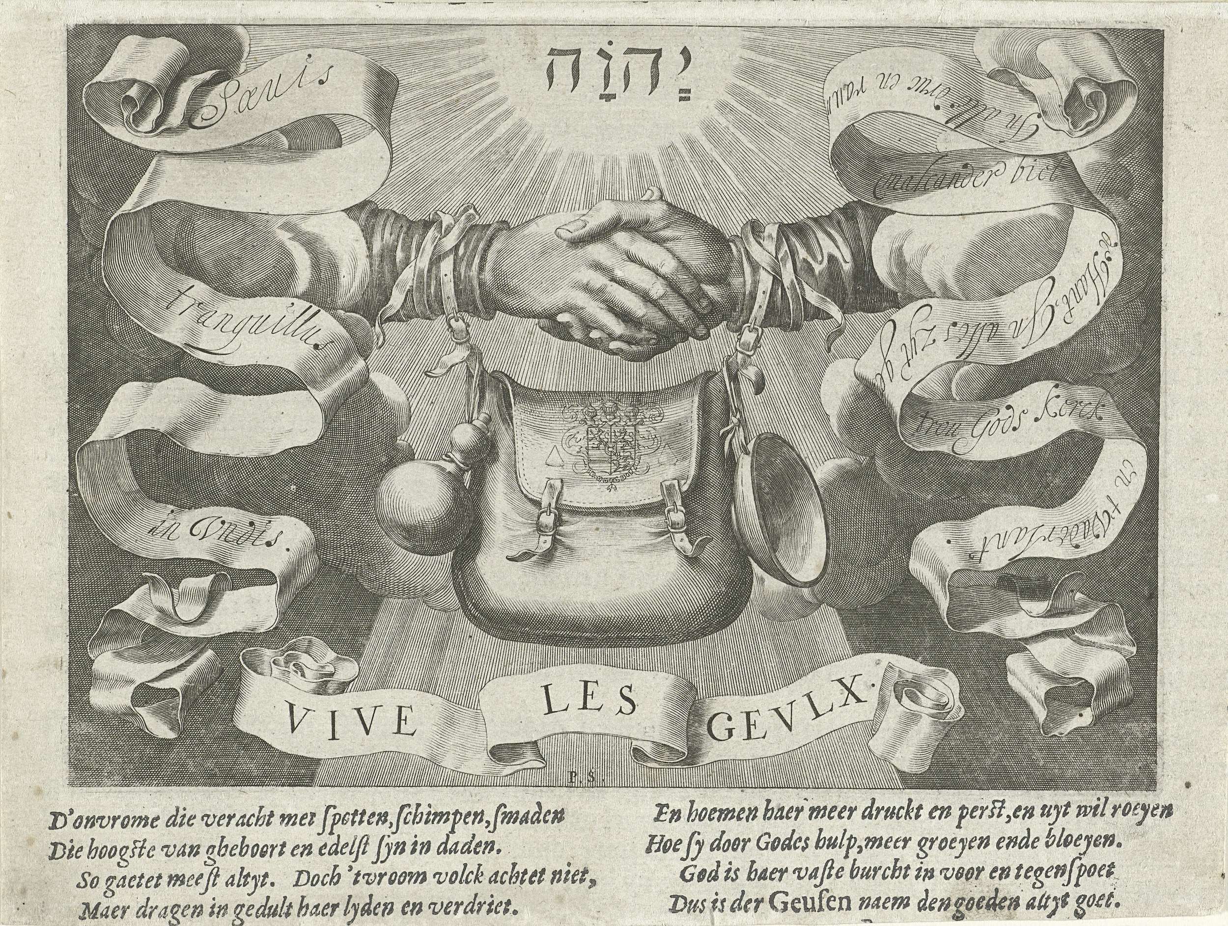 Geuzenembleem. Bedelzak met bedelnappen aan weerszijden, hierboven twee ineengeslagen handen en het tetragram. Hieromheen banderollen met teksten en het opschrift: Vive les Geulx. Onder de plaat een onderschrift van 2 kolommen van 4 regels in het Nederlands. Met gedrukte tekst op achterzijde.