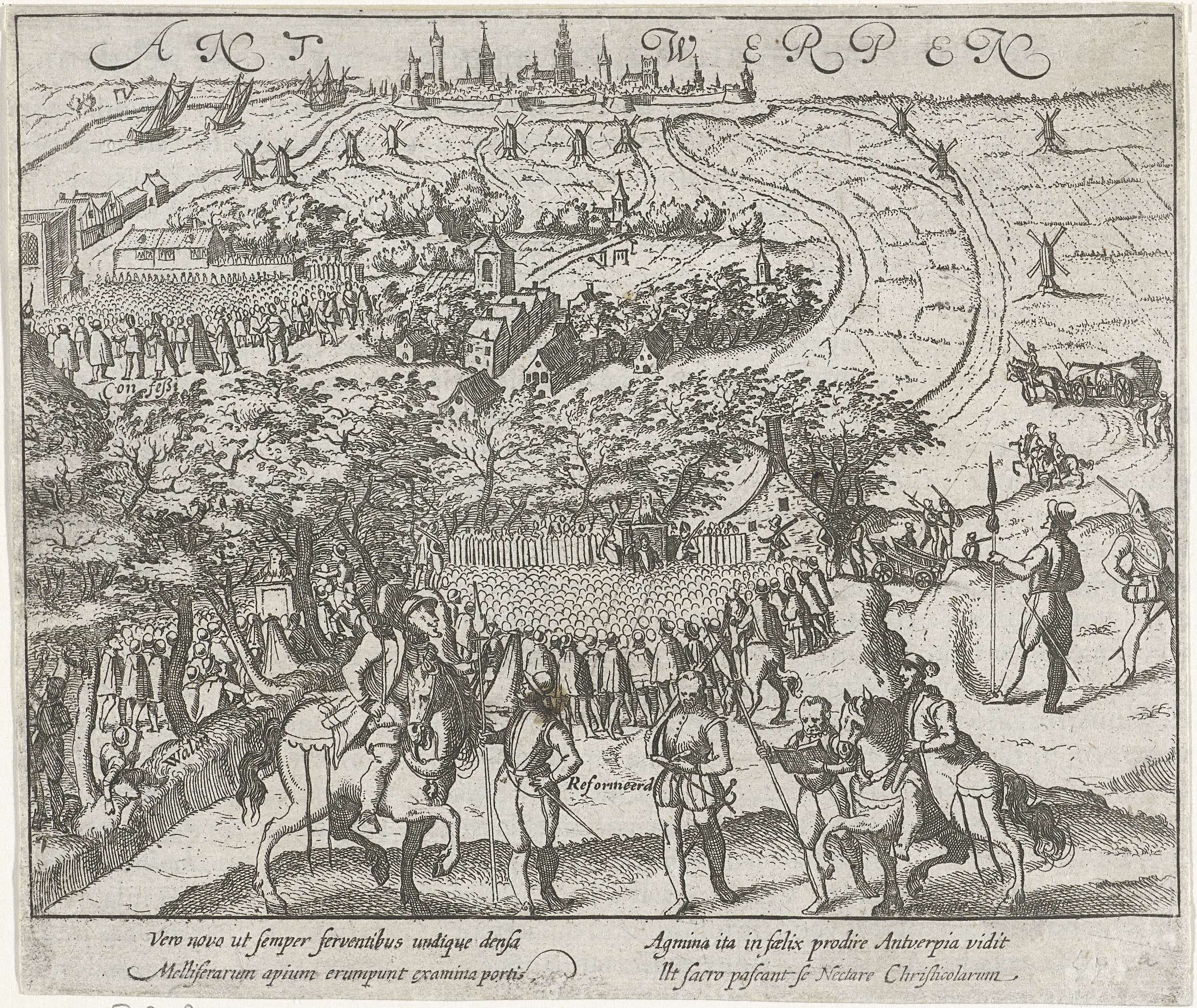 Hagenpreken buiten Antwerpen, 14 juni 1566. Calvinistische bijeenkomsten in de bossen, in de verte de stad Antwerpen. Op de voorgrond gewapende calvinistische ordebewakers. Met onderschrift van 4 regels in het Latijn. Genummerd: 4. Op verso bedrukt met Latijnse tekst.