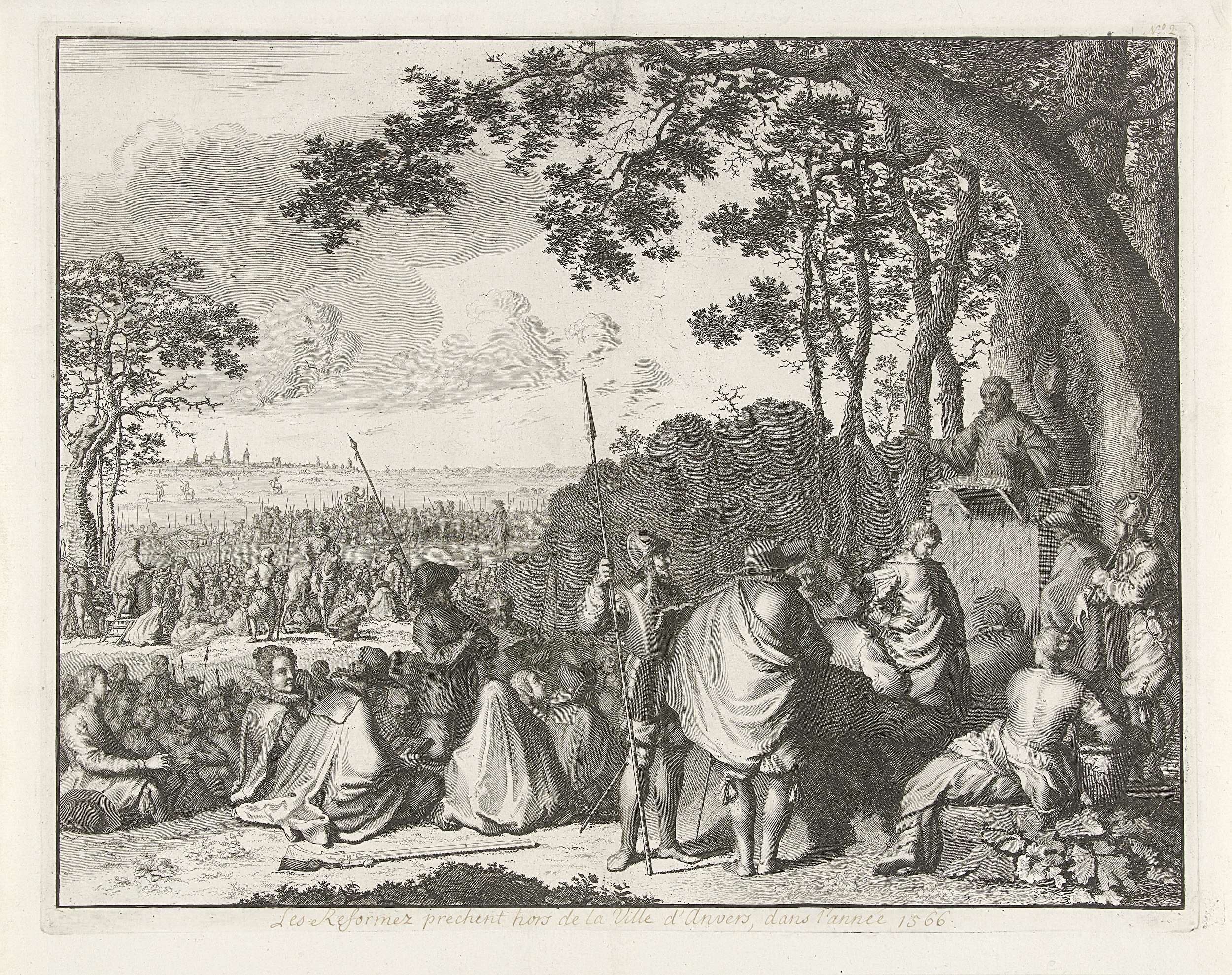 Hagenpreken buiten Antwerpen, 14 juni 1566. Calvinistische bijeenkomsten in de bossen, in de verte de stad Antwerpen. Op de voorgrond spreekt een predikant onder een boom. Ook enkele gewapende calvinistische ordebewakers. Met pen een onderschrift in het Frans in de marge.