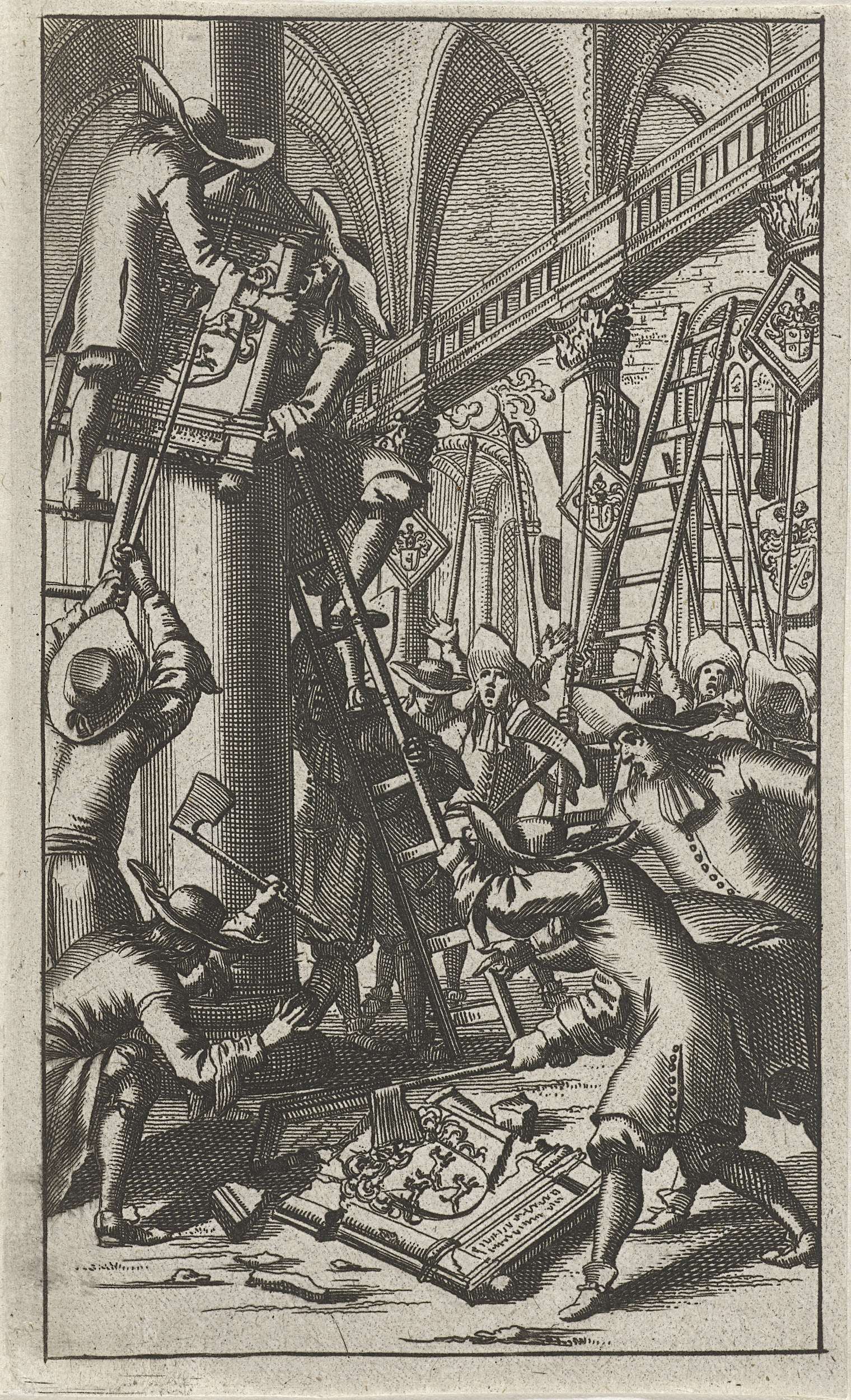 Vernietiging van wapenborden van de familie van de gebroeders Johan en Cornelis de Witt in een kerk te Den Haag, 1672. Een groep woedende mannen haalt met ladders in een kerk de wapenborden van de zuilen en slaat deze met bijlen stuk.