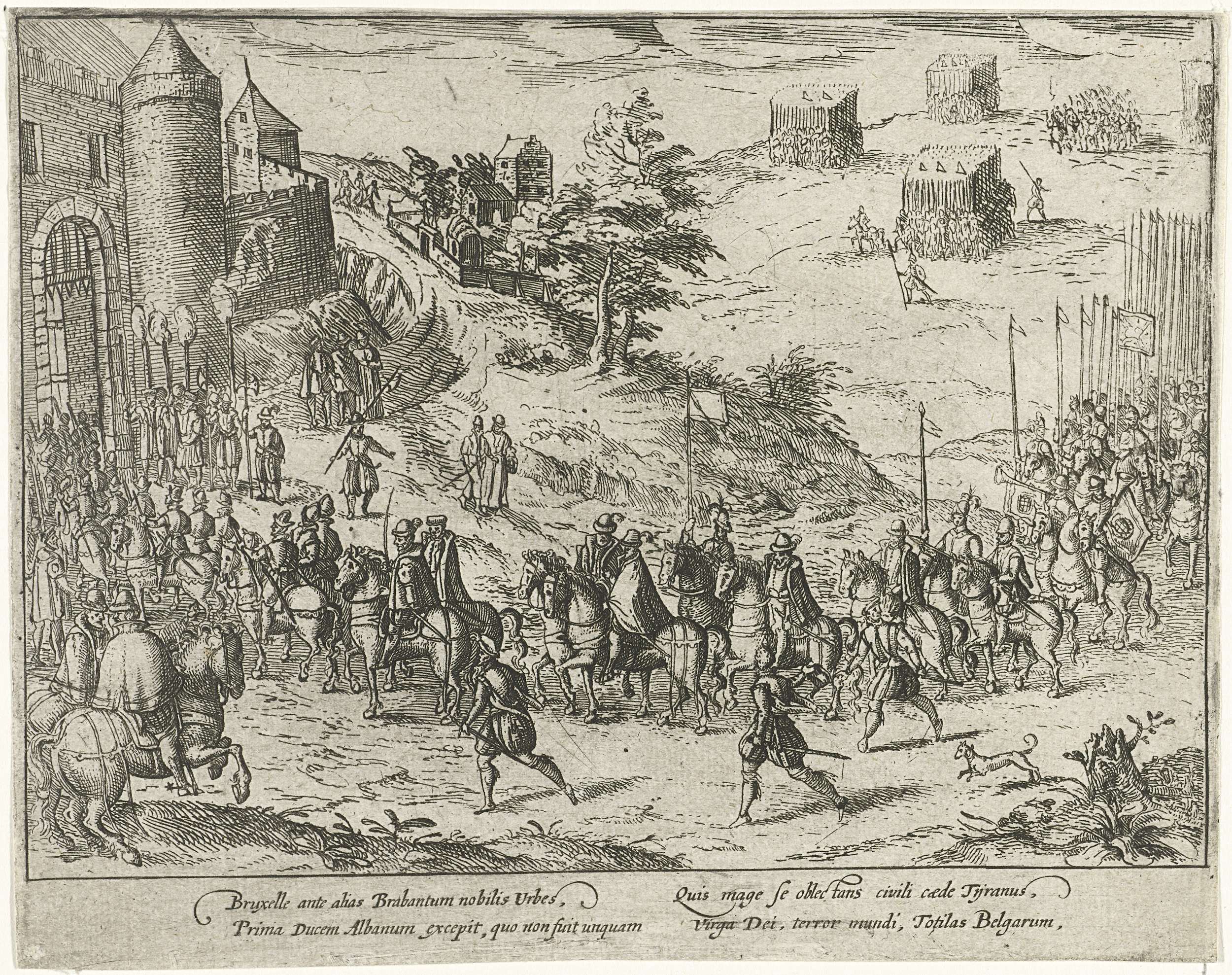 Aankomst van de hertog van Alva te Brussel, 22 augustus 1567. Alva te paard arriveert met zijn leger bij de poort van de stad. Met onderschrift van 4 regels in het Latijn. Achterzijde onbedrukt.