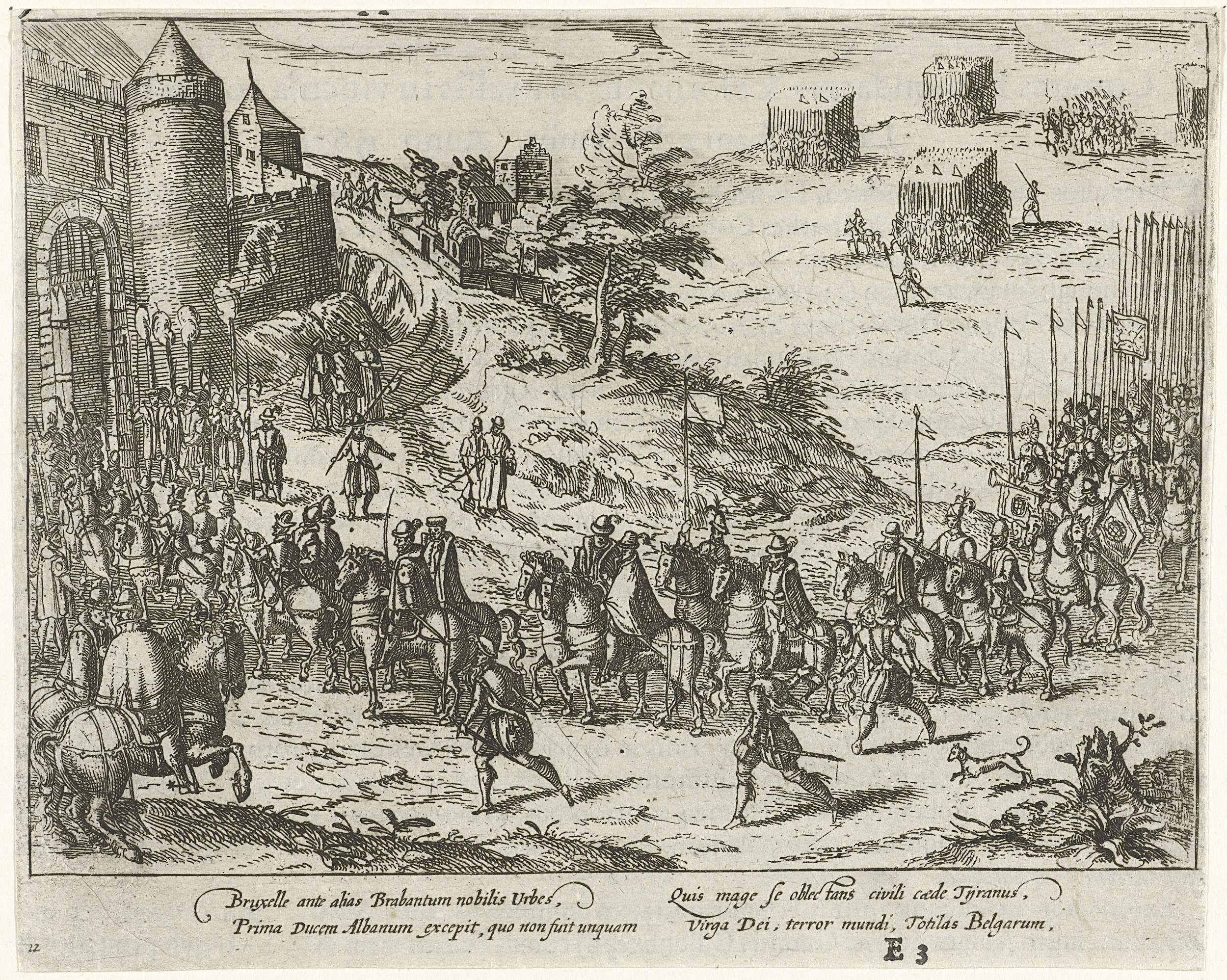 Aankomst van de hertog van Alva te Brussel, 22 augustus 1567. Alva te paard arriveert met zijn leger bij de poort van de stad. Met onderschrift van 4 regels in het Latijn. Genummerd: 12. Bedrukt op achterzijde met tekst in het Latijn.