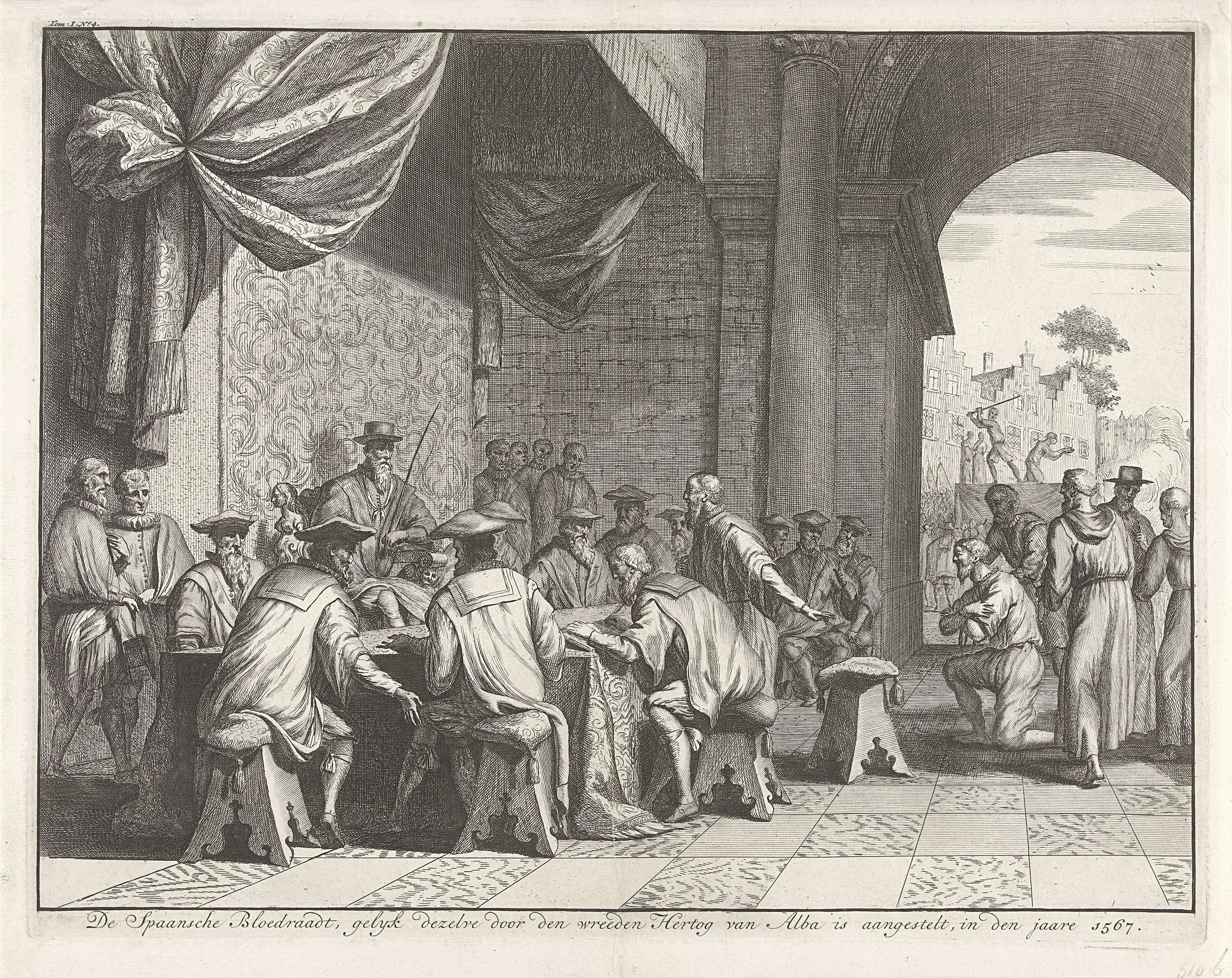 Zitting van de Raad van Beroerten, bijgenaamd de Bloedraad, voorgezeten door de hertog van Alva gezeten op een troon met de gerechtsroede in de hand, 1567. In een open hof zit Alva op een troon achter een grote tafel waaraan zijn raadsheren. Een man knielt voor de raad neer. Rechtsachter wordt een man onthoofd.