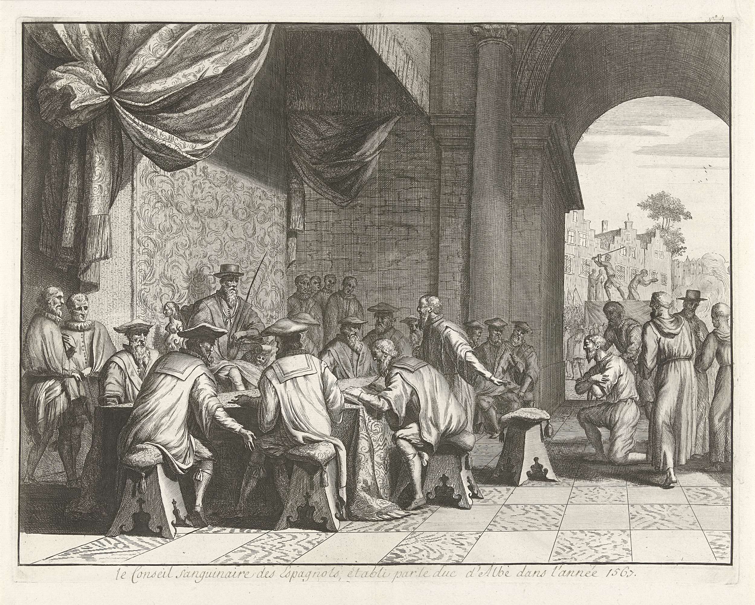 Zitting van de Raad van Beroerten, bijgenaamd de Bloedraad, voorgezeten door de hertog van Alva gezeten op een troon met de gerechtsroede in de hand, 1567. In een open hof zit Alva op een troon achter een grote tafel waaraan zijn raadsheren. Een man knielt voor de raad neer. Rechtsachter wordt een man onthoofd.