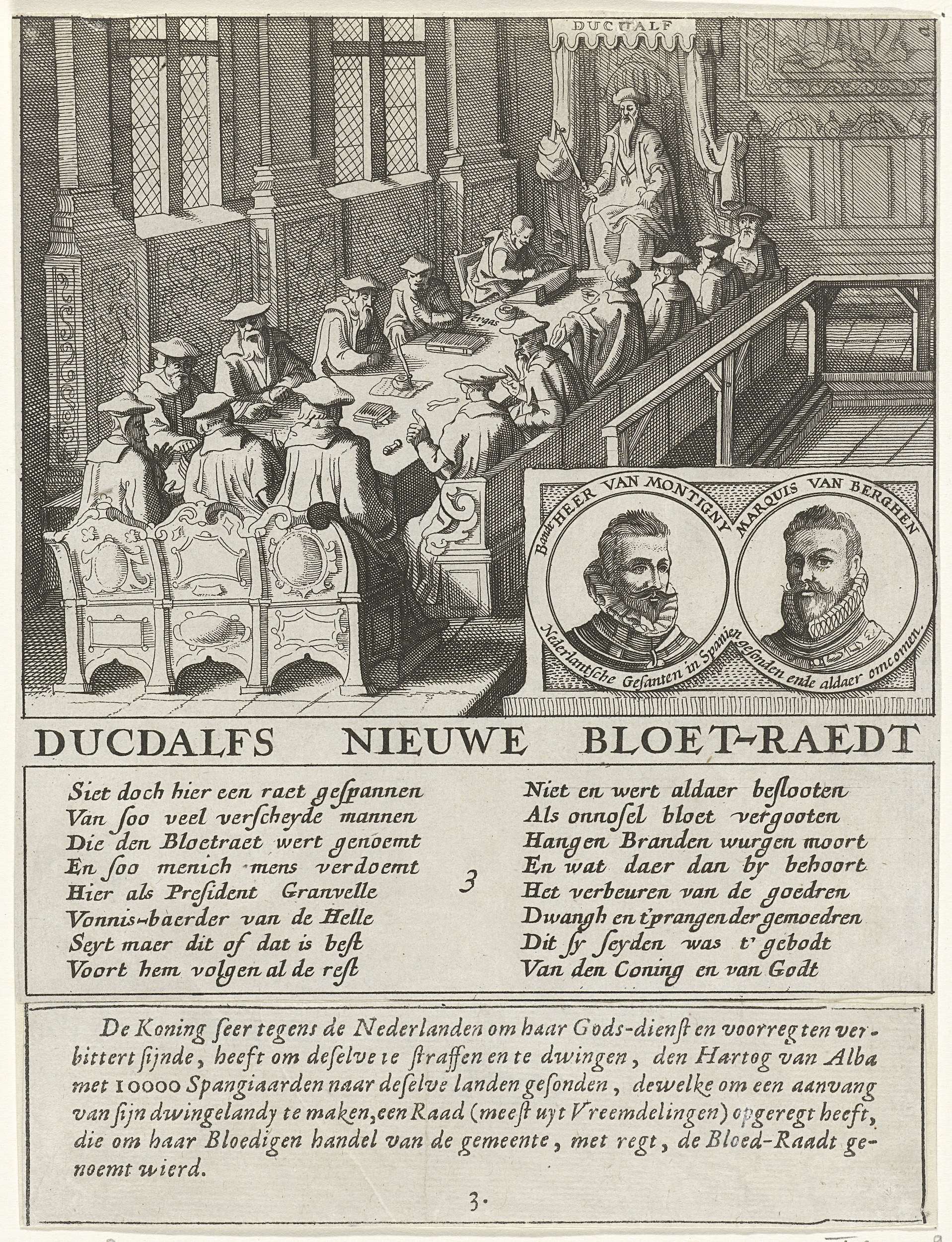 Zitting van de Bloedraad met Alva op troon, 1567. Rechtsonder portretten van Montigny en de markies van Bergen. Onder de voorstelling een vers van 16 regels in 2 kolommen, hieronder geplakt een beschrijving in 6 regels, in het Nederlands. Genummerd: 3.