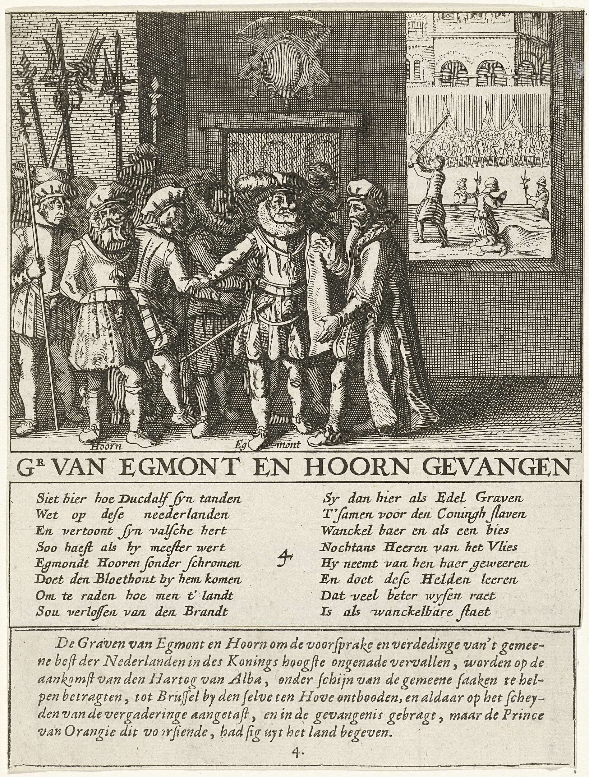 De graven van Egmond en Horne gevangengenomen door Alva, 10 september 1567. Door een venster is te zien de onthoofding van één van de graven te Brussel, mei 1568. Onder de voorstelling een vers van 16 regels in 2 kolommen, hieronder geplakt een beschrijving in 6 regels, in het Nederlands. Genummerd: 4.