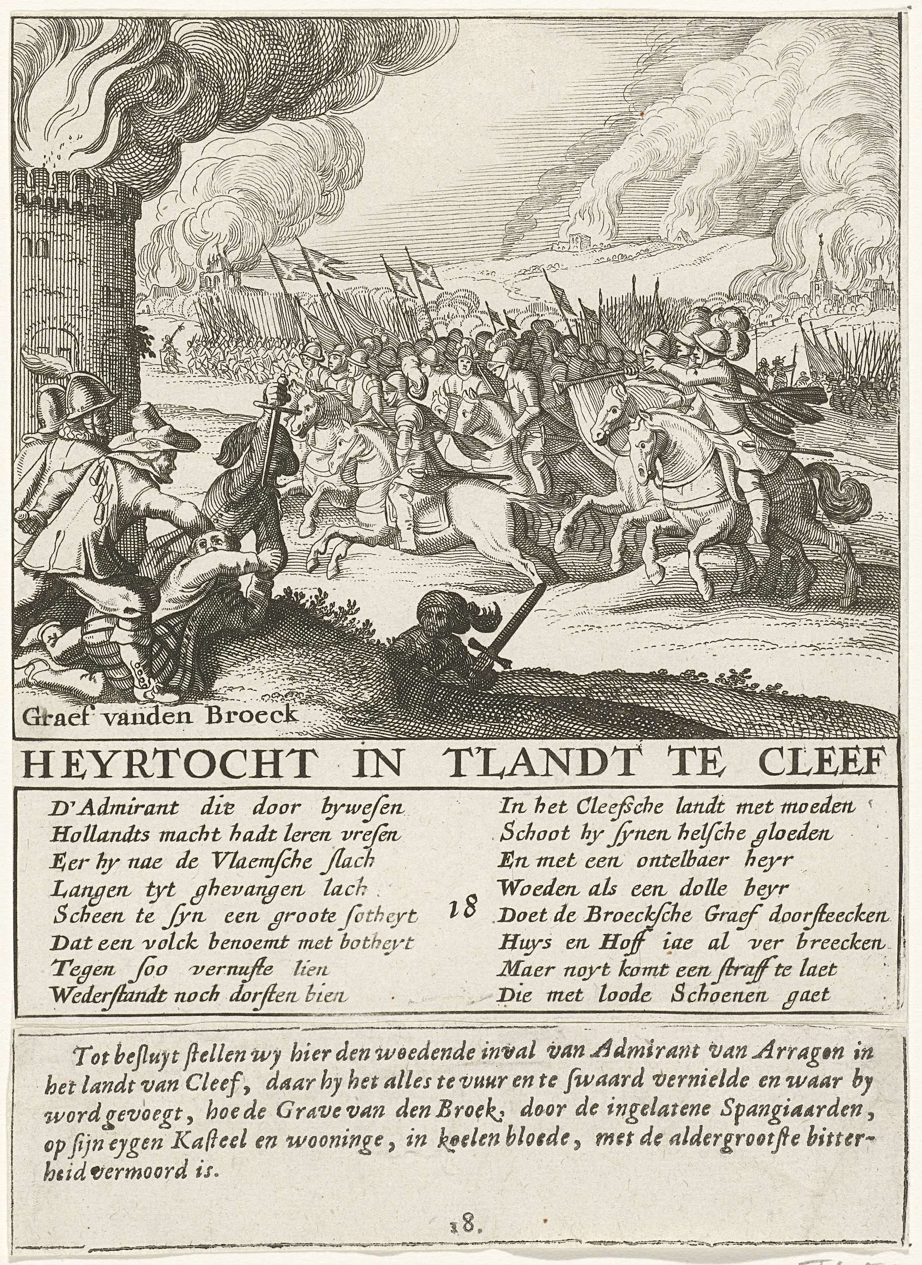 Gevechten in het land van Kleef en de moord op de graaf van den Broek, ca. 1600. Onder de voorstelling een vers van 16 regels in 2 kolommen, hieronder geplakt een beschrijving in 5 regels (incompleet), in het Nederlands. Genummerd: 18.