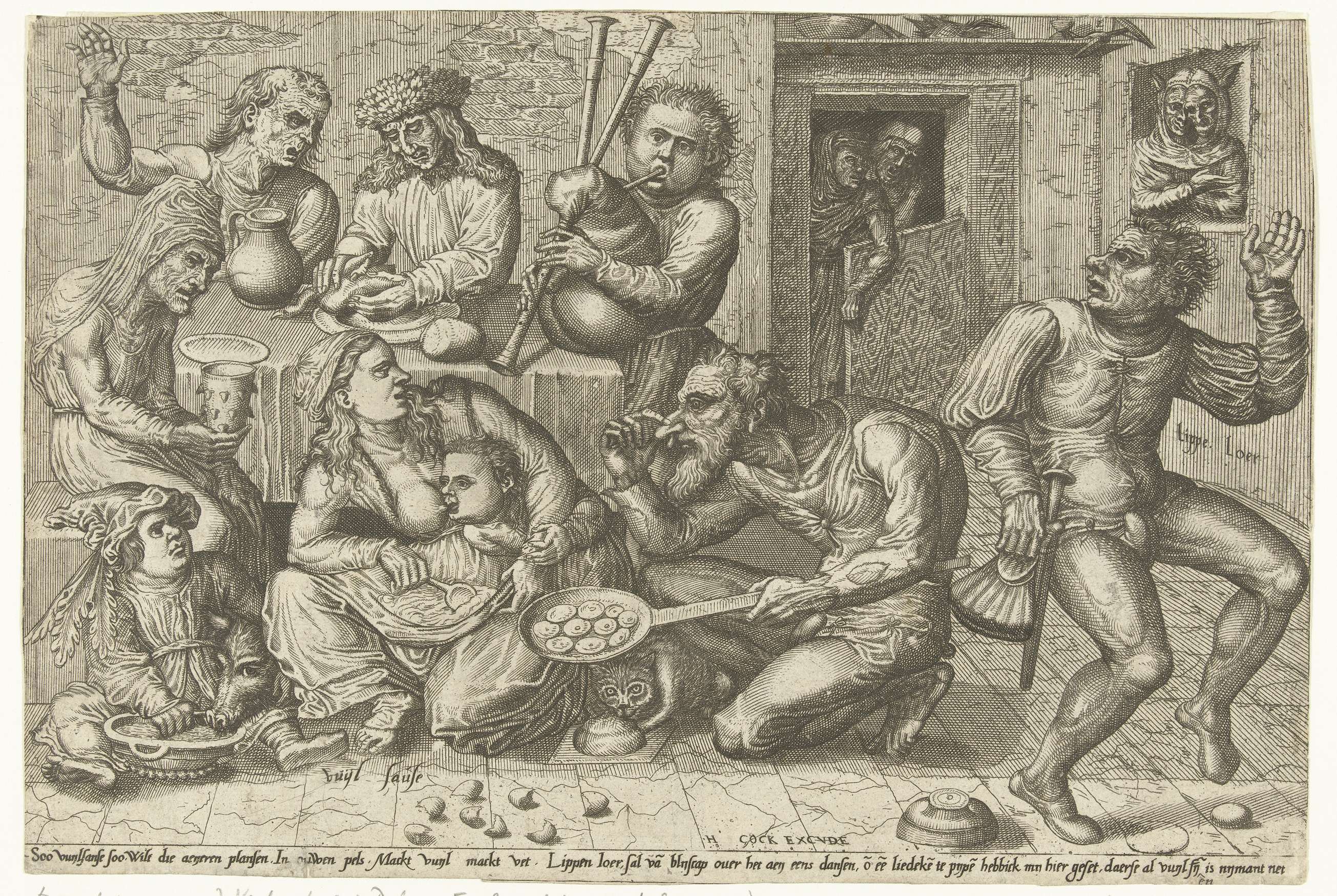 Het vuile huishouden. Interieur met meerdere personen. Een vrouw roert een saus van eieren in haar schoot en geeft een kind de borst, verder een kind met een varken, een dansende man genaamd Lippe Loer, man met pan met poffertjes, doedelzakspeler. Een nar met twee koppen kijkt door het raam naar binnen. Met onderschrift van ...