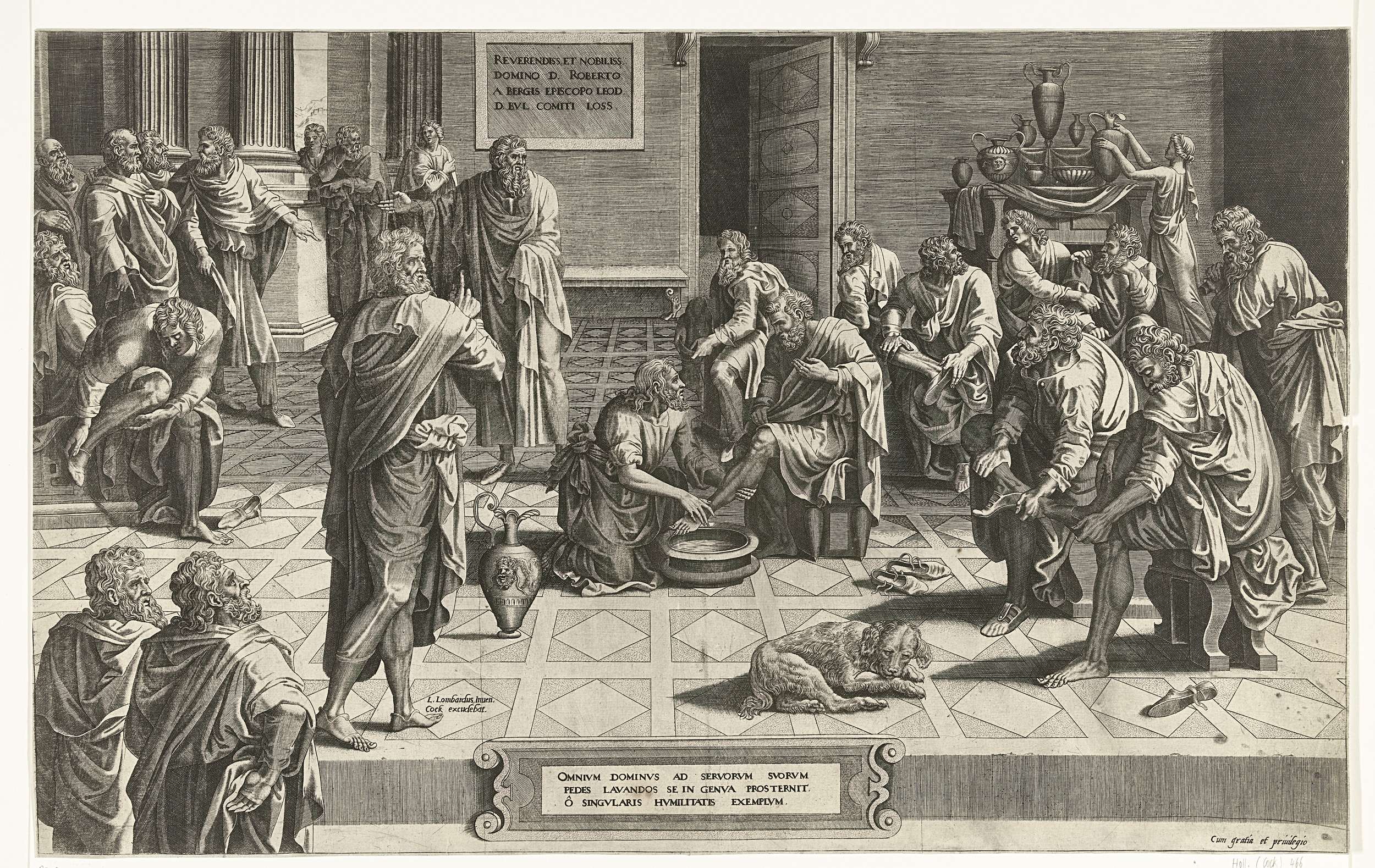 Christus wast zijn discipelen een voor een de voeten. De discipelen die nog niet aan de beurt waren zitten op banken en stoelen en trekken hun schoenen uit. Onder de voorstelling de titel in het Latijn in een cartouche.