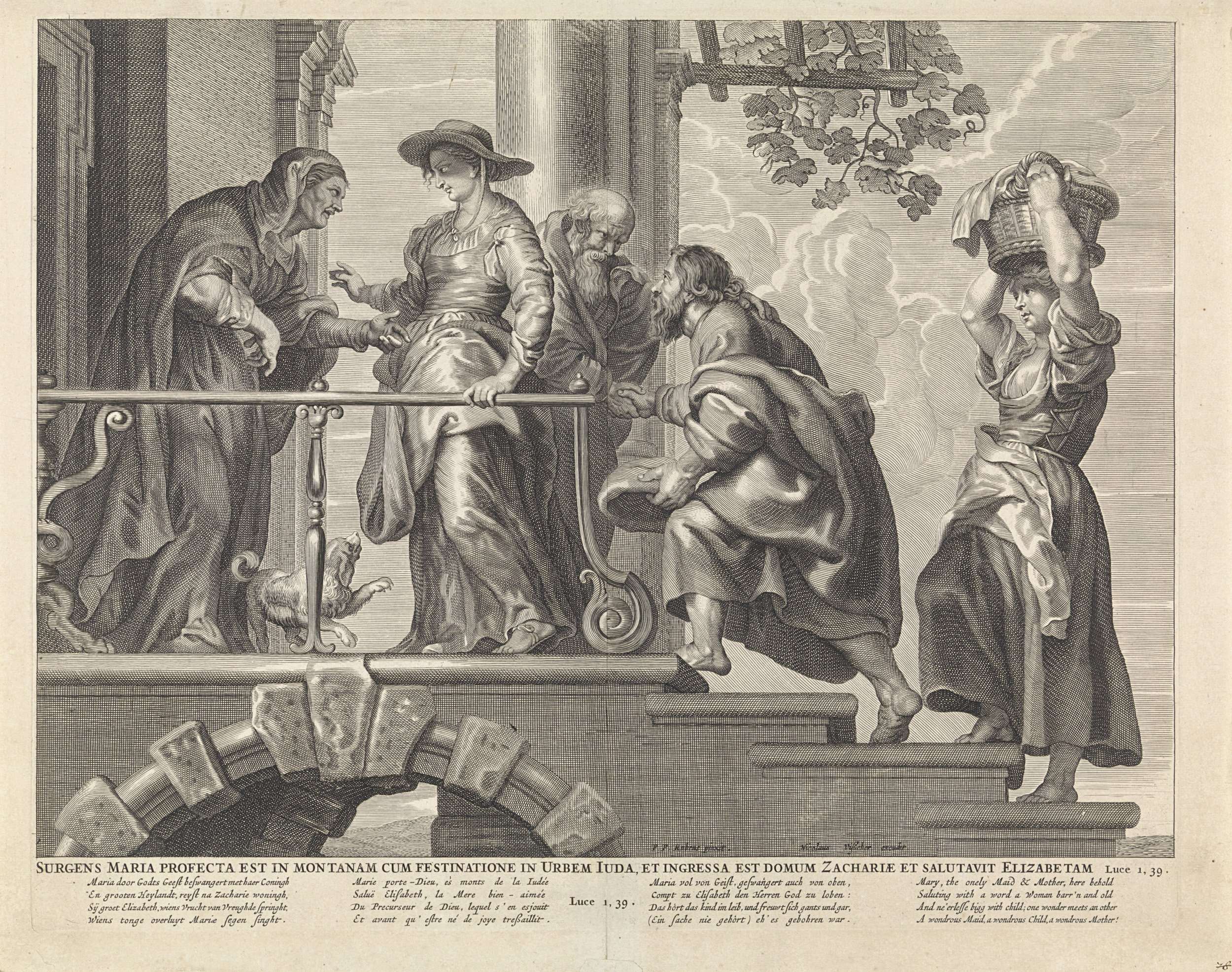 Het bezoek van Maria aan haar nicht Elisabet (Luc. 1:39). Jozef en Zacharias schudden elkaar de hand. Rechts op de trap staat een vrouw met een mand op haar hoofd. De prent heeft een onderschrift het Latijn. In de marge, in vier kolommen, een vierregelige tekst in het Nederlands, het Frans, het Duits en in ...