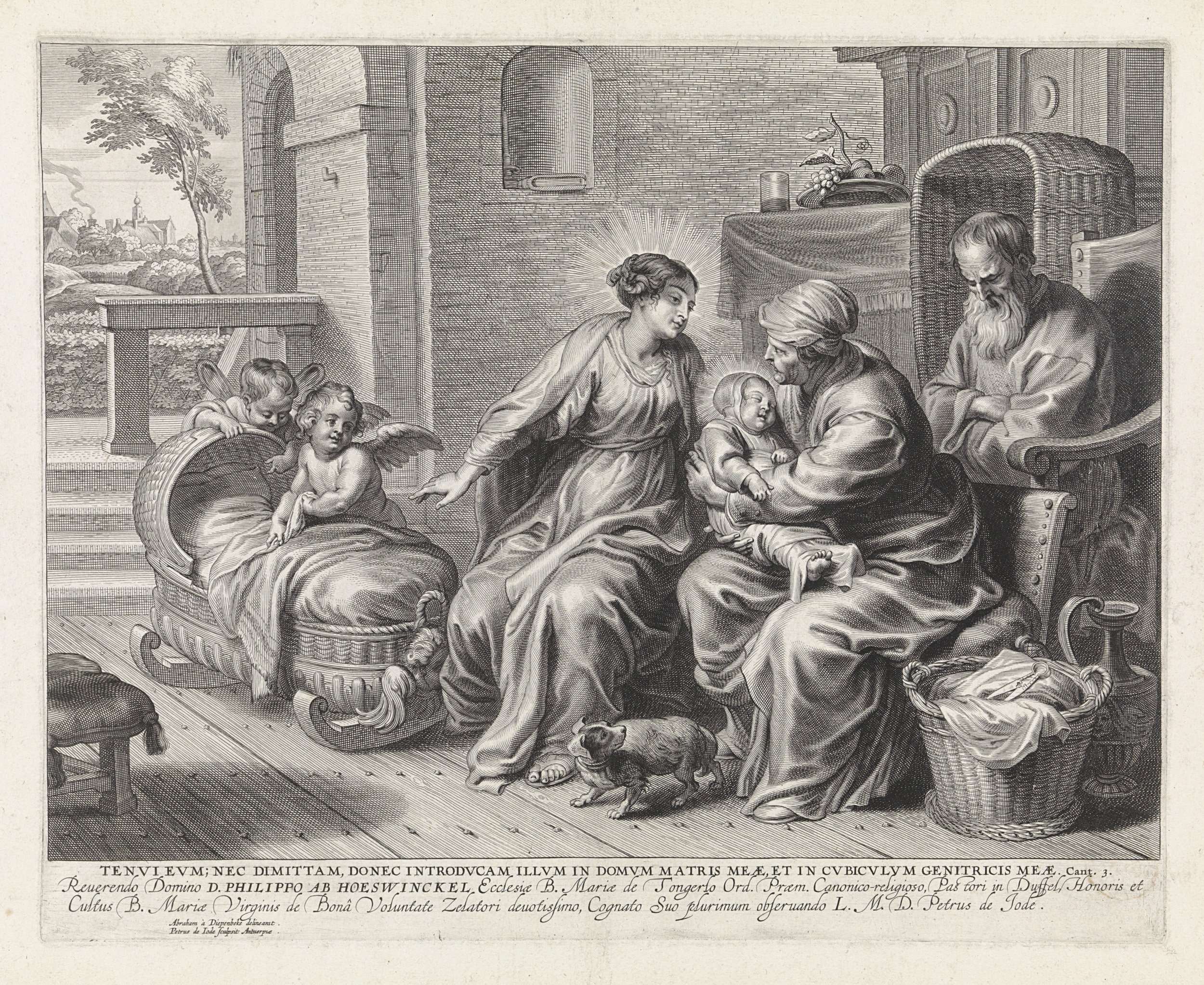Patio met de Heilige Familie en de Heilige Anna. Anna heeft het Christuskind in haar armen. Jozef zit achter haar, slapend. Links een wieg met twee engelen erbij. Op de voorgrond een hond. De prent heeft een onderschrift in het Latijn.