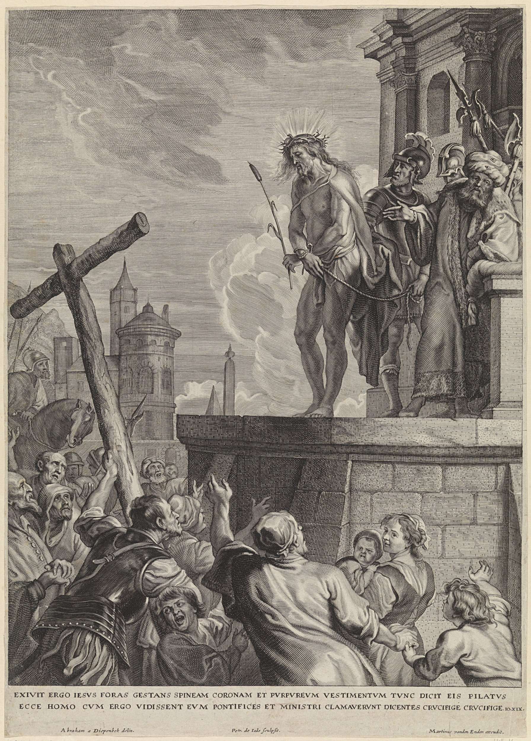 Pilatus, staand op het balkon van zijn paleis, toont Christus aan het volk. Christus, met lendendoek, mantel en doornenkroon, houdt een rietstengel vast. De mensen onder het balkon roepen om zijn kruisiging, sommigen hebben hun arm geheven. Links staat een man die het kruis omhoog houdt. In de marge een tweeregelig onderschrift in het Latijn.