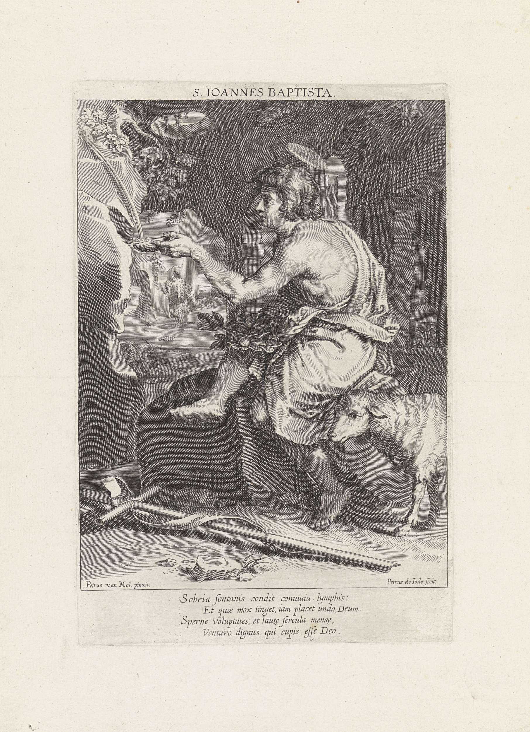 Johannes de Doper met zijn attributen, zittend bij een bron in een ruïne. Hij vangt water op uit de bron. In de marge een vierregelig onderschrift in het Latijn.
