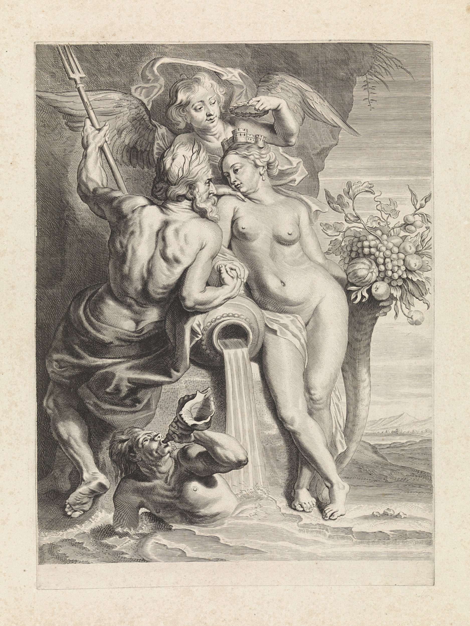 Allegorische voorstelling met Neptunus (als personificatie van de zee), op de rug gezien, en Cybele (als personificatie van de aarde). Cybele staat naast een curnucopia en wordt door een engel gekroond met een lauwerkrans. Op de voorgrond een riviergod, blazend op een schelp. Met een lege marge onder de voorstelling.
