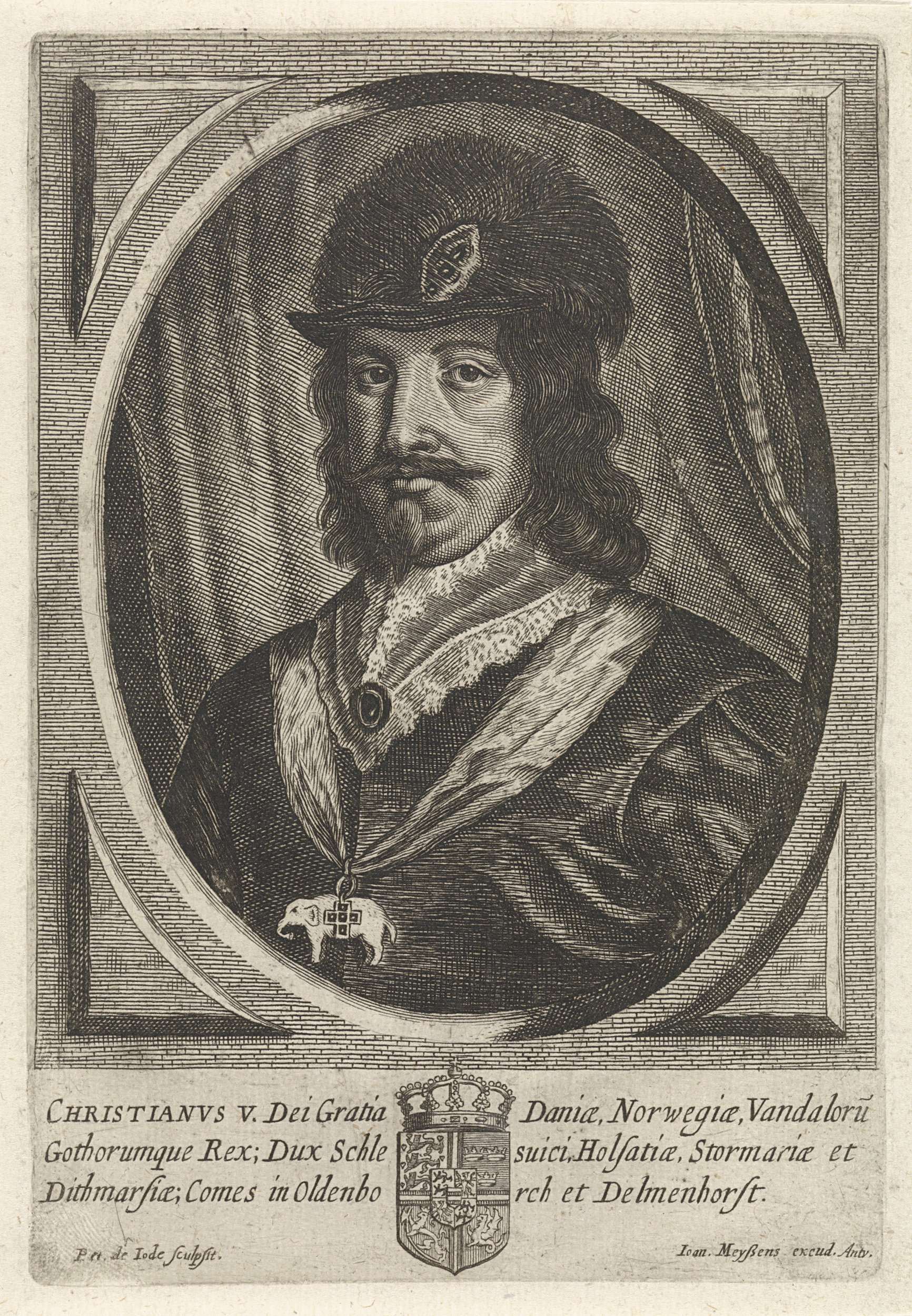 Busteportret van Christiaan V. Om zijn hals hangt een lint met een hanger van de Orde van de Olifant. Het portret is gevat in een ovale omlijsting. In de marge zijn wapenschild en een drieregelig onderschrift in het Latijn.