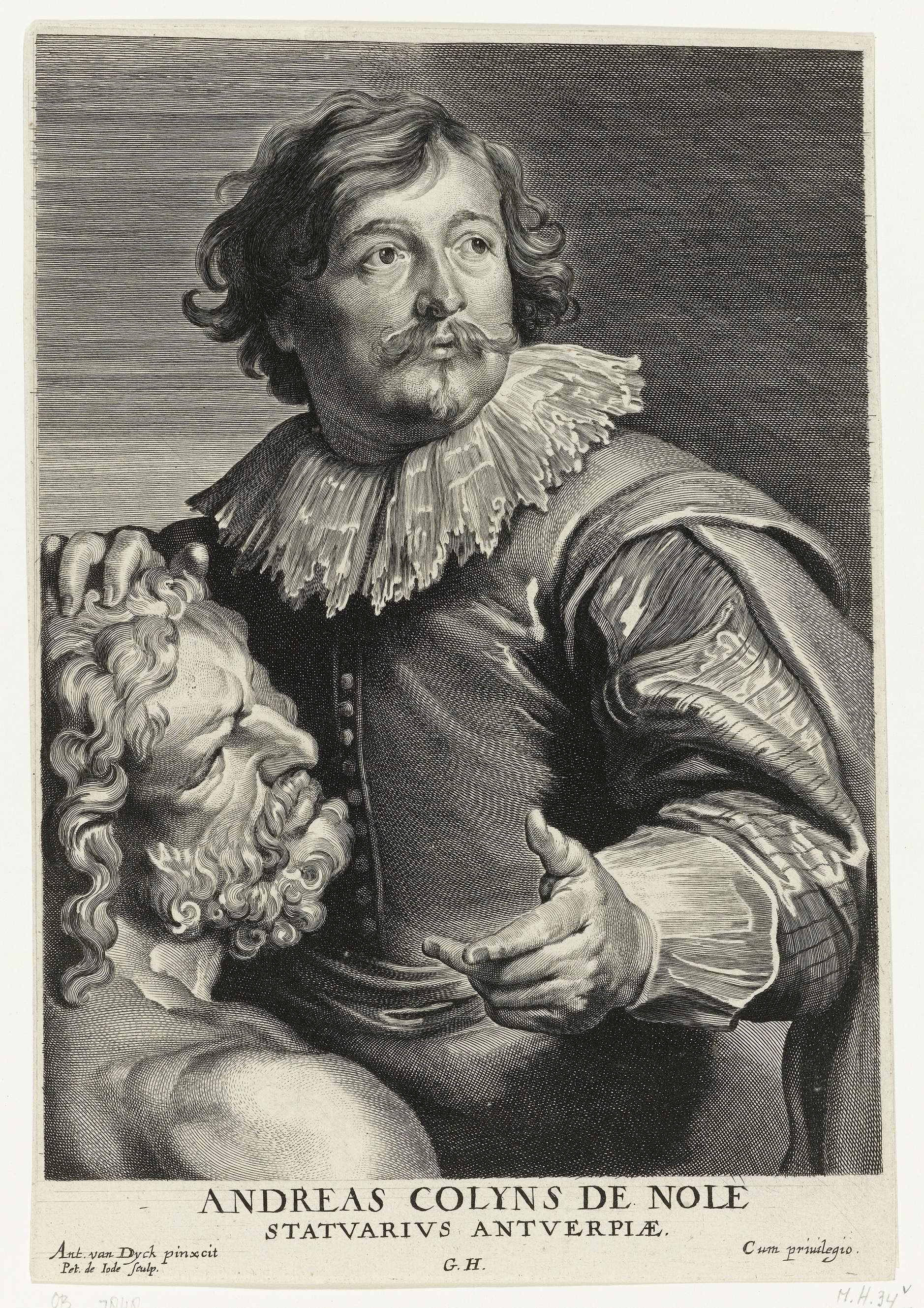 Portret van de beeldhouwer Andreas Colijns de Nole, ten halven lijve. Met zijn rechterhand leunt hij op een marmeren beeld. In de marge de naam en het beroep van de geportretteerde.
