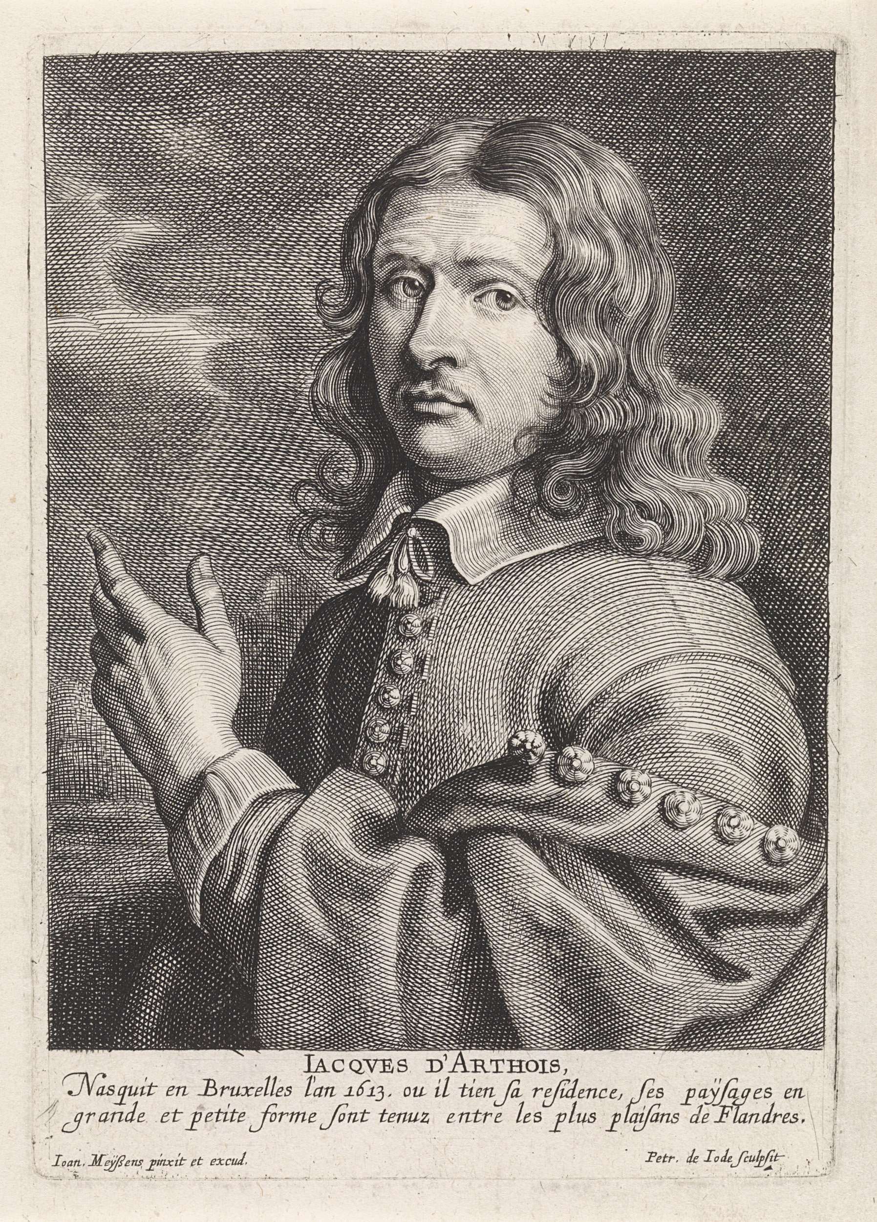 Portret van de Vlaamse schilder Jacques d'Arthois, ten halven lijve. Hij heeft zijn linkerhand omhoog geheven. In de marge de naam van de geportretteerde en een tweeregelig onderschrift in het Frans.