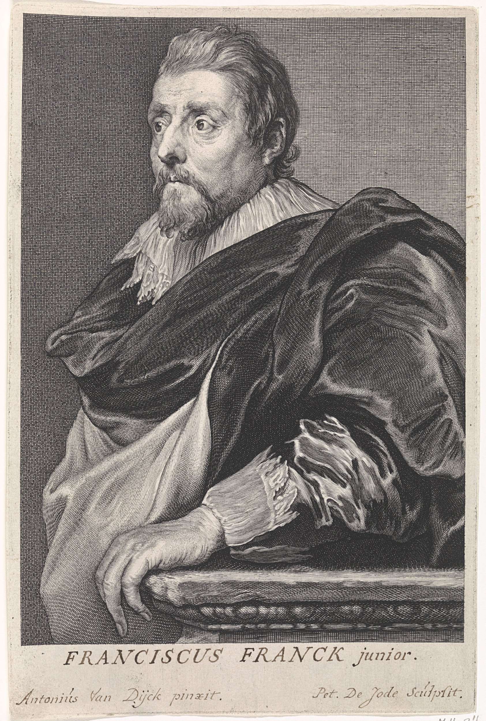 Portret van de kunstenaar Frans Francken (II), ten halven lijve. Met zijn linkerhand leunt hij op een tafel. In de marge de naam van de geportretteerde handgeschreven in bruine inkt.