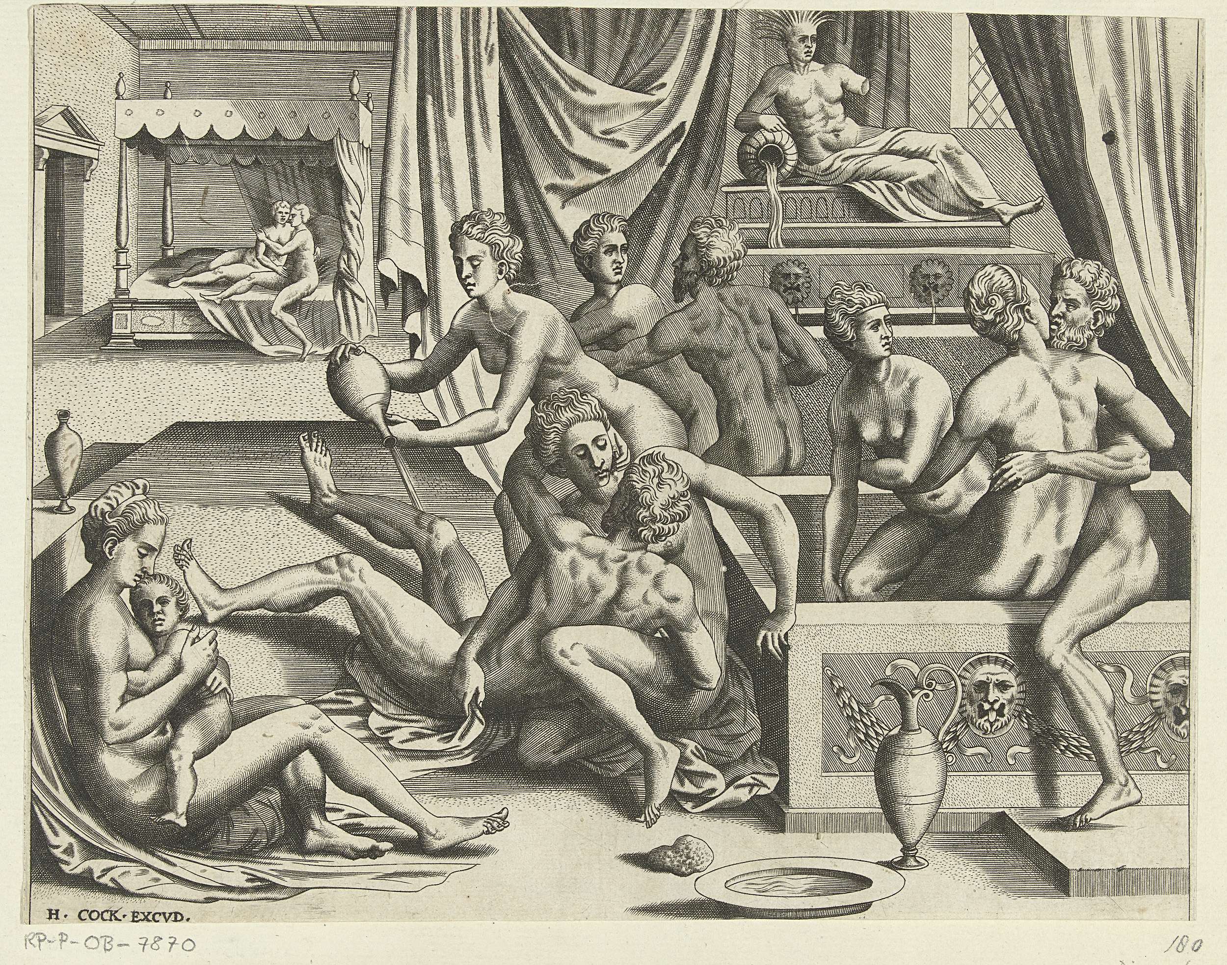 Mannen en vrouwen in een badhuis. Links een moeder met haar kind. Op de achtergrond een vrijend stel in een hemelbed.