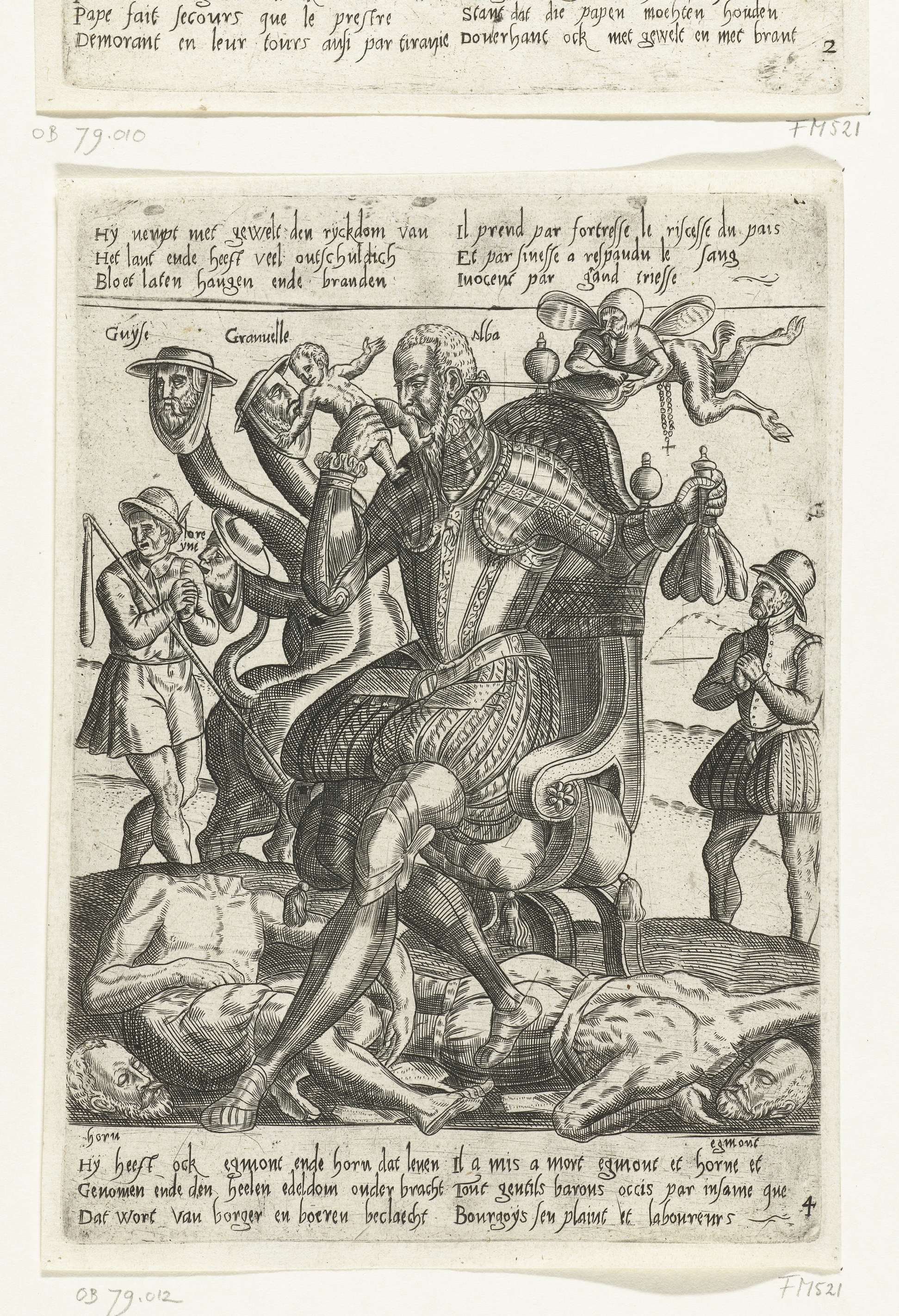 Het harde beleid van Alva wekt veel weerzin. Dat maakt hem een dankbaar doelwit: talrijke spotprenten maken hem zwart. Hier zit Alva op zijn troon, vergezeld door een driekoppig monster en een duivel. Hij verorbert een kind, symbool voor de Nederlanden. Op de achtergrond de verarmde en lijdende bevolking. Aan zijn voeten de graven van ...