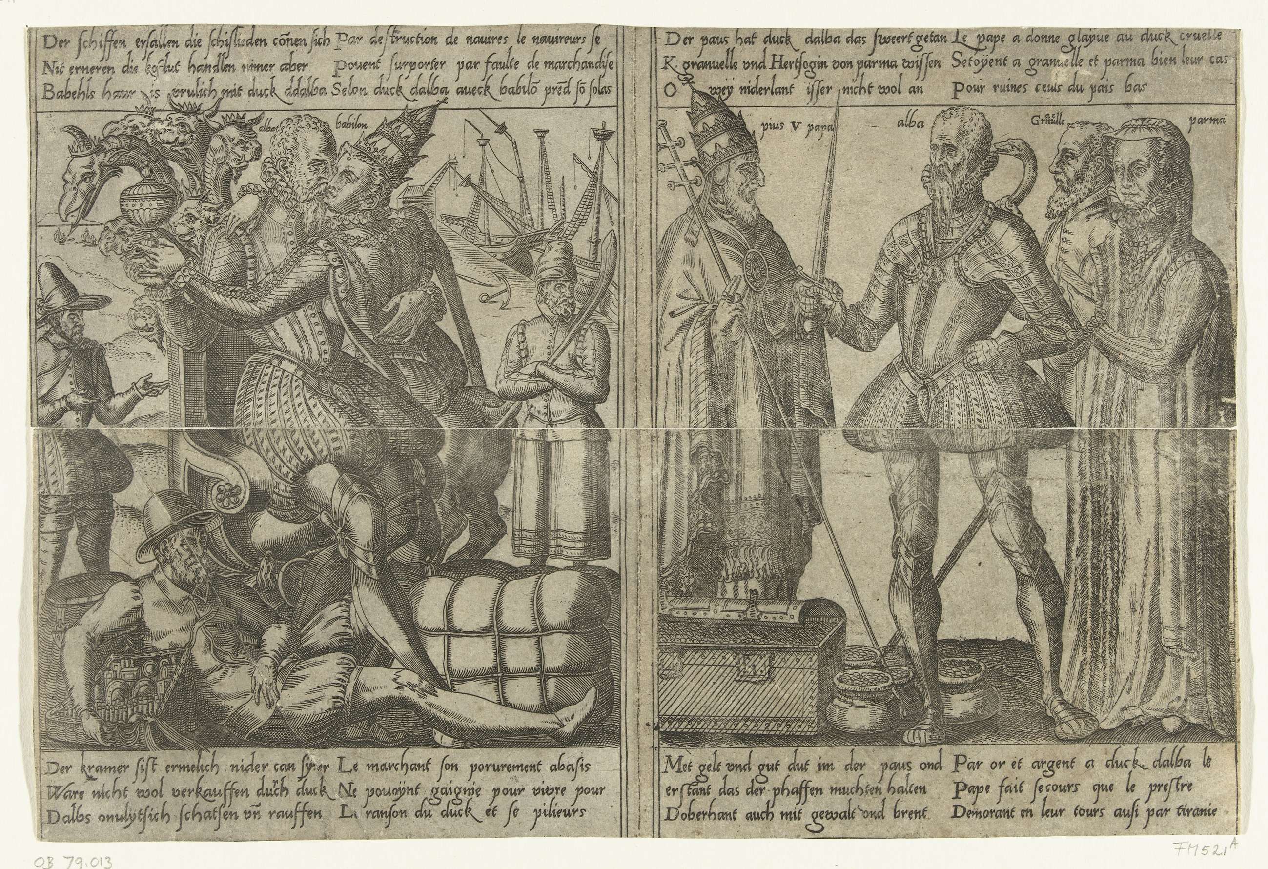 Twee voorstellingen uit de serie op één blad. Links: de hertog van Alva vrijt met de hoer van Babylon en de economie van het land raakt in verval. Kooplui, marskramer en schippers zijn werkloos, de schepen liggen in de havens. Rechts: Margaretha van Parma, Granvelle en de paus steunen Alva's missie. Alva ontvangt van paus ...
