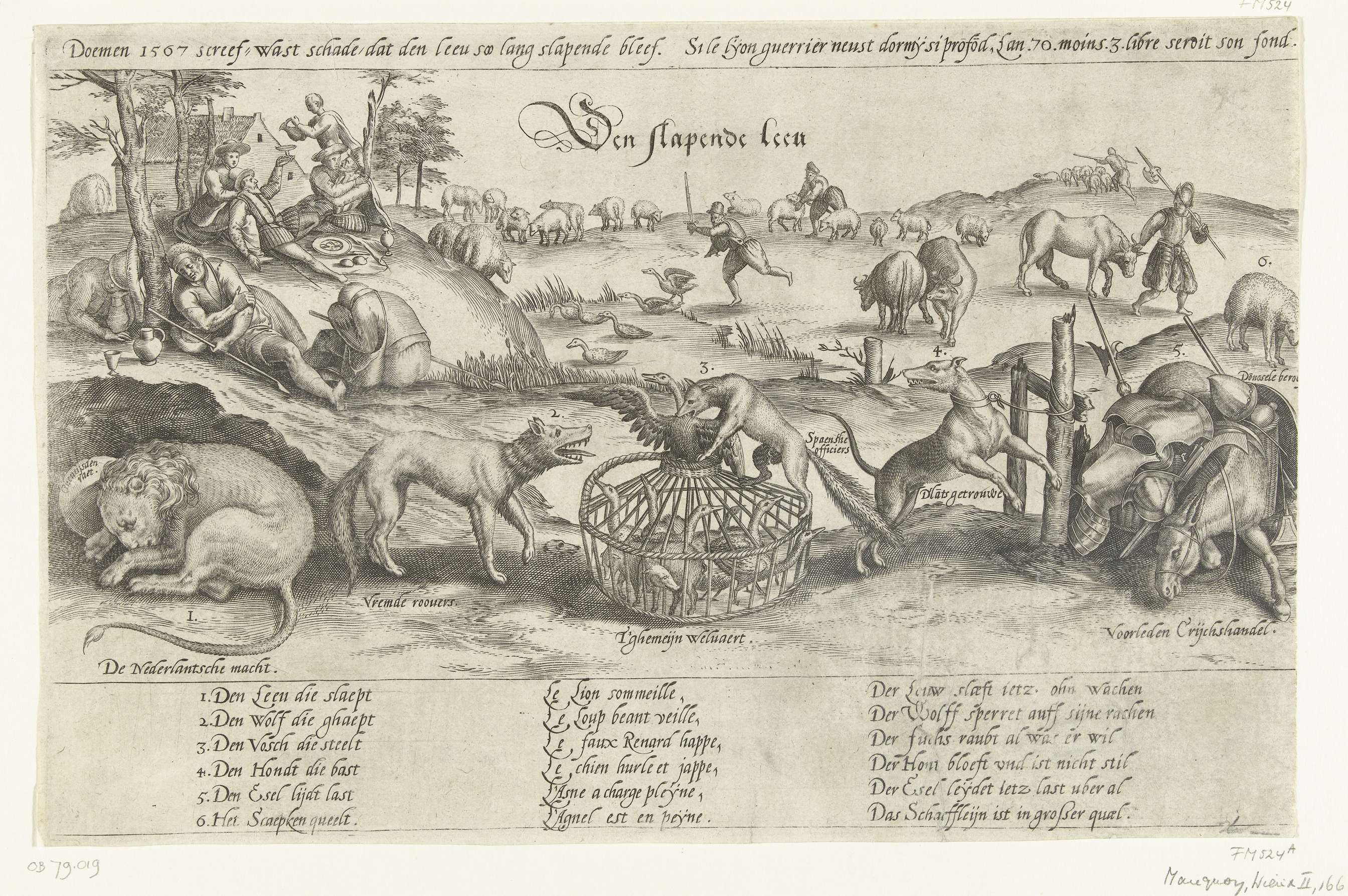 Allegorie op politieke situatie in de Nederlanden in het jaar 1567. Alle partijen verbeeld door dieren. Terwijl de Nederlandse Leeuw slaapt roven de vos en de wolf ganzen uit een kooi. Op de achtergrond slapende herders en plezier makende heren terwijl het vee gestolen wordt. Met opschrift van 1 regel boven de voorstelling en in ...