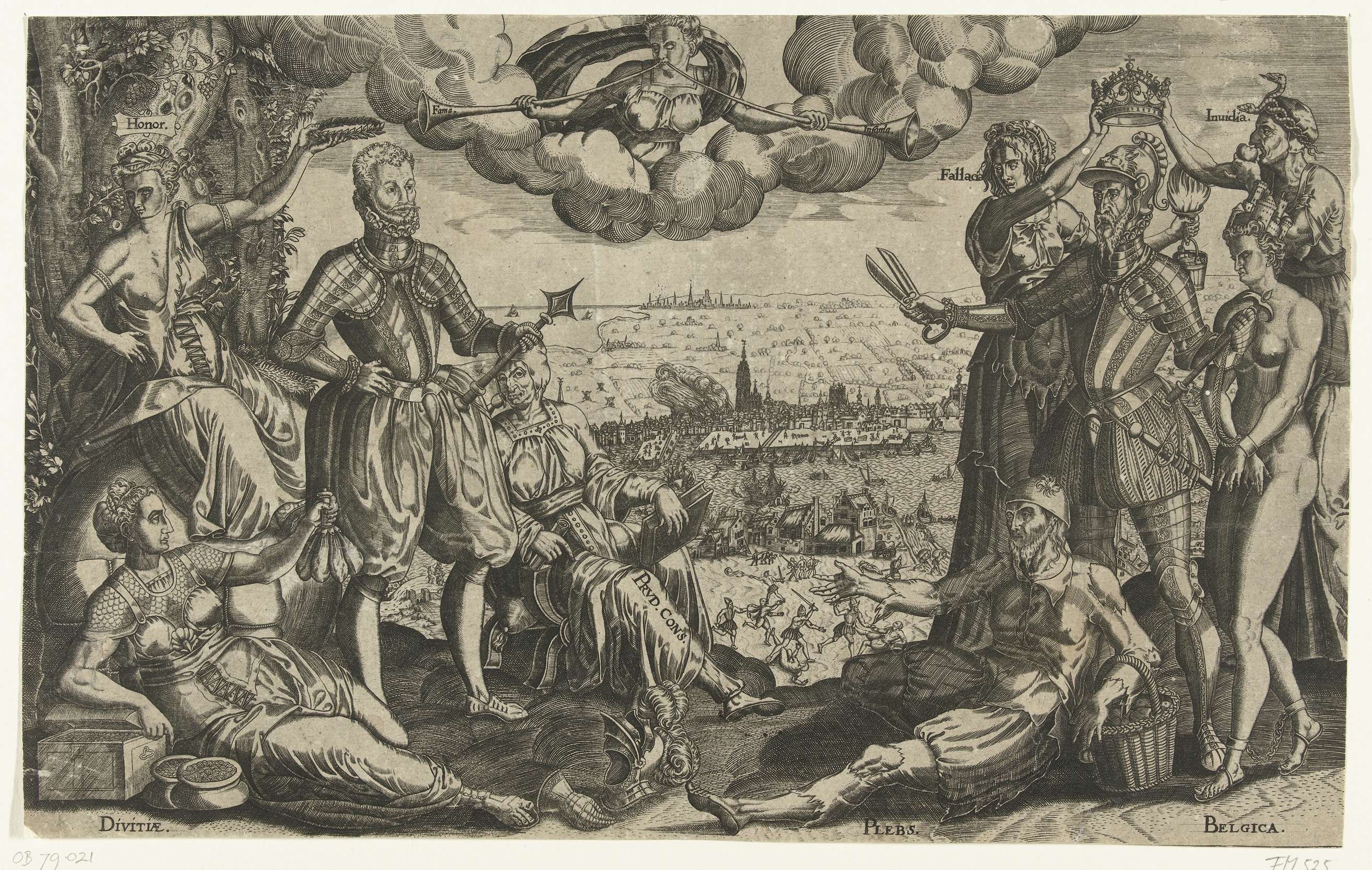 Allegorische vergelijking tussen Oranje en Alva, met op de achtergrond de Spaanse Furie. Links Willem van Oranje begeleid door de personificaties Eer (Honor), Rijkdom (Divitiae) en Wijze Raad (Prud. Cons.). Rechts Alva tussen Valsheid (Fallacia) en Afgunst (Invidia). Hij voert de Nederlandse Maagd (Belgica) naakt en geboeid aan de arm. Aan zijn voeten het Volk ...