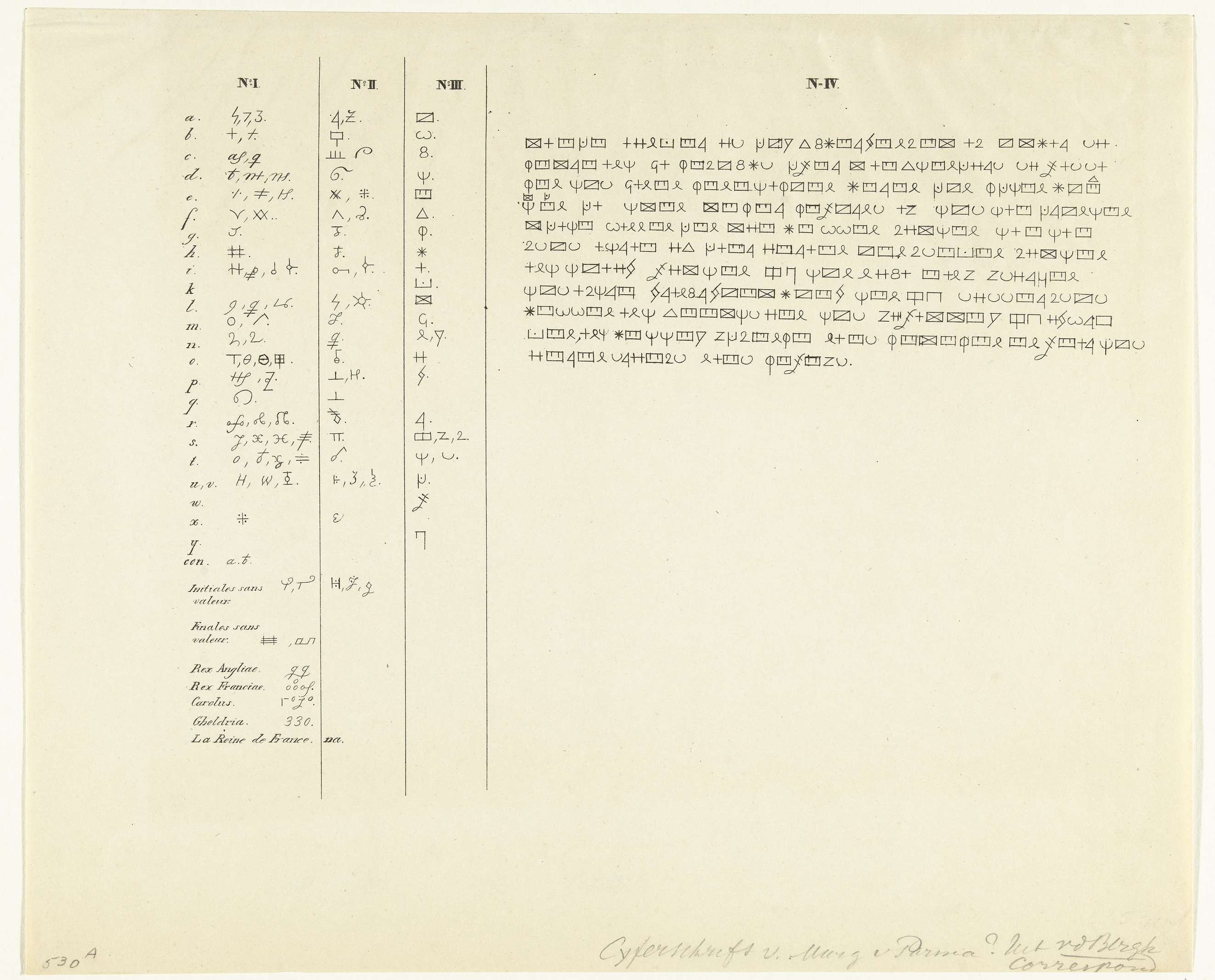 Vier voorbeelden en de vertaalsleutel van het geheimschrift of cijferschrift gebruikt door Margaretha van Parma in haar correspondentie, 1567.