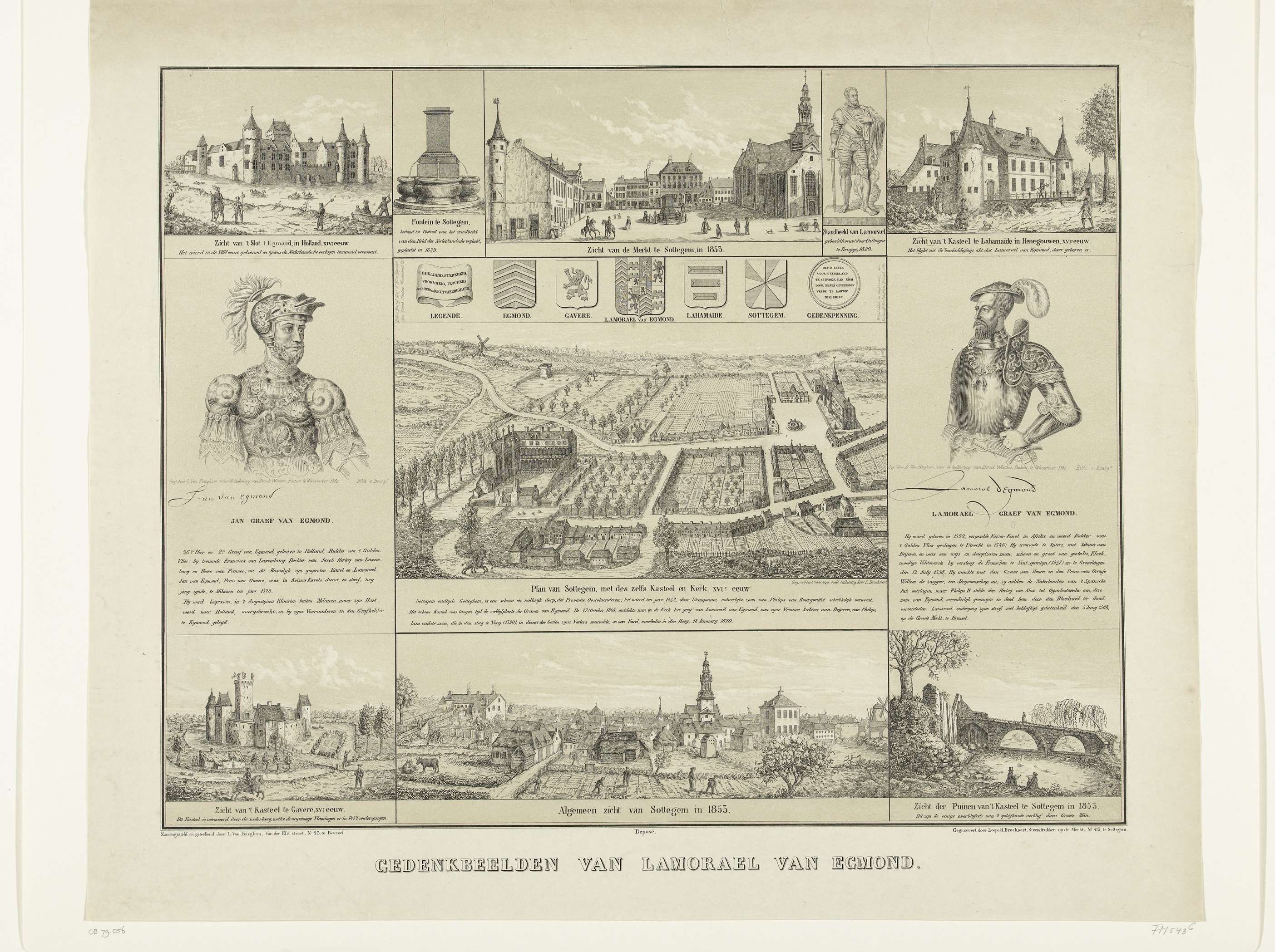 Blad met overzicht van kastelen van de graven van Egmond, gezichten in het dorp Zottegem met de ruïne van het kasteel van de graven van Egmond, met portretten en standbeeld van Lamoraal en zijn vader Jan, graaf van Egmond.