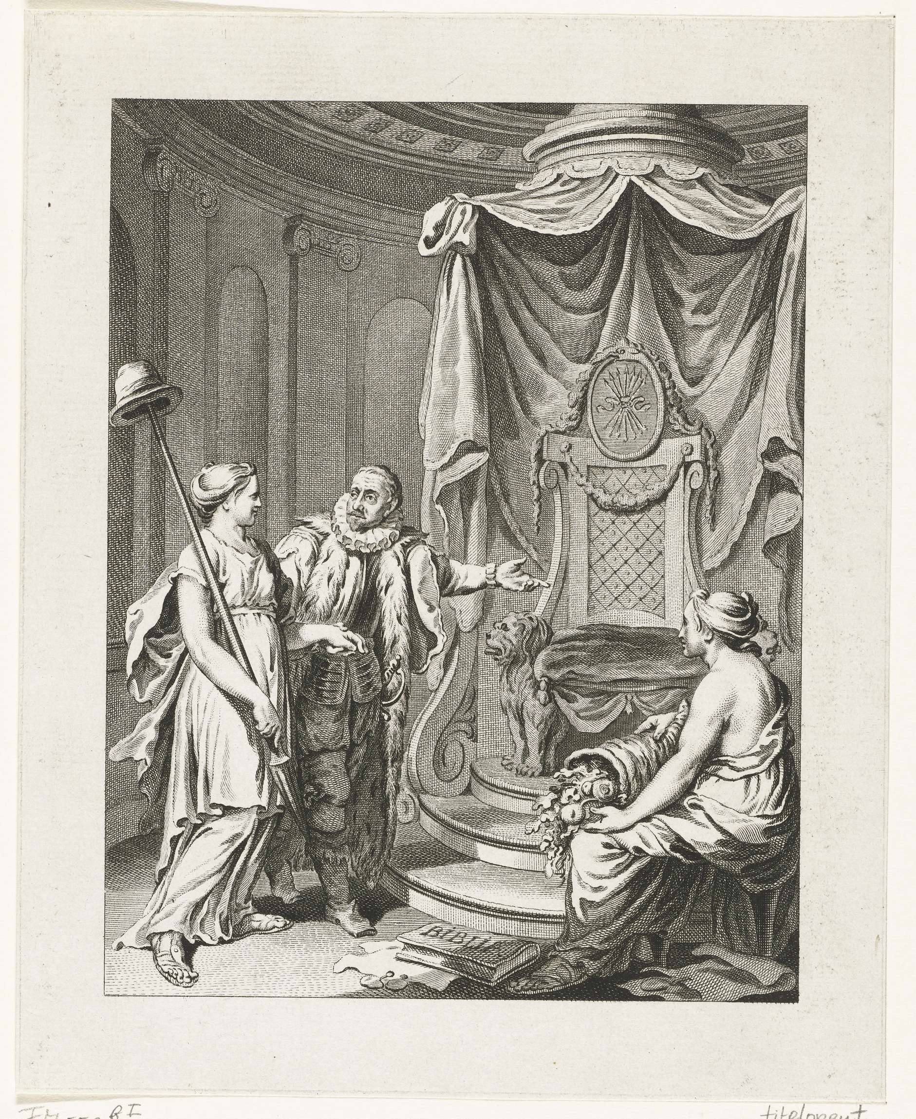 Titelplaat voor de serie taferelen uit het leven van prins Willem I, 1568-1584. De prins van Oranje leidt de Nederlandse Maagd met lans en vrijheidshoed naar haar troon.