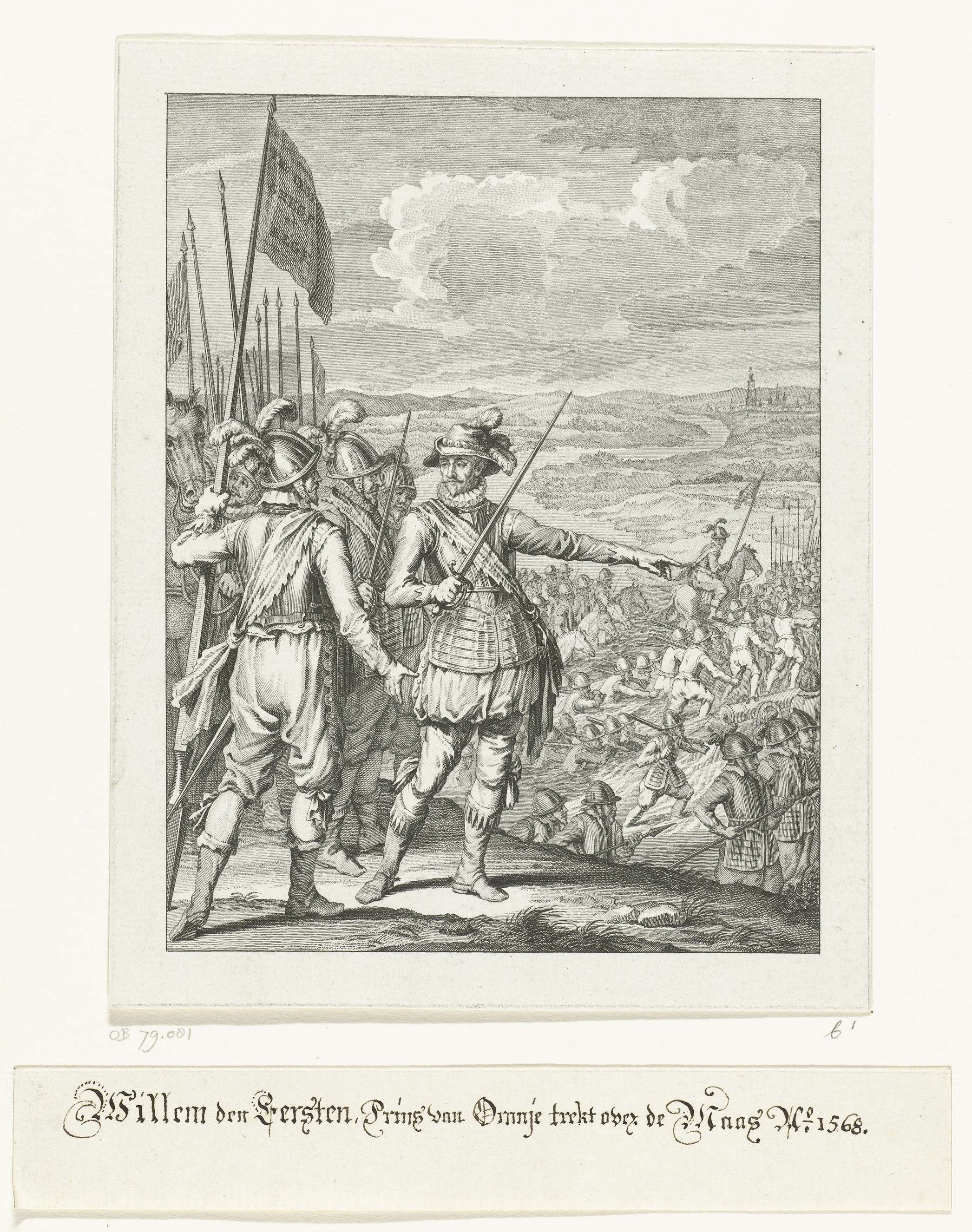 Willem van Oranje, staande op de voorgrond tussen zijn officieren, wijst zijn leger de weg bij het oversteken van de Maas, oktober 1568. Eerste zang.