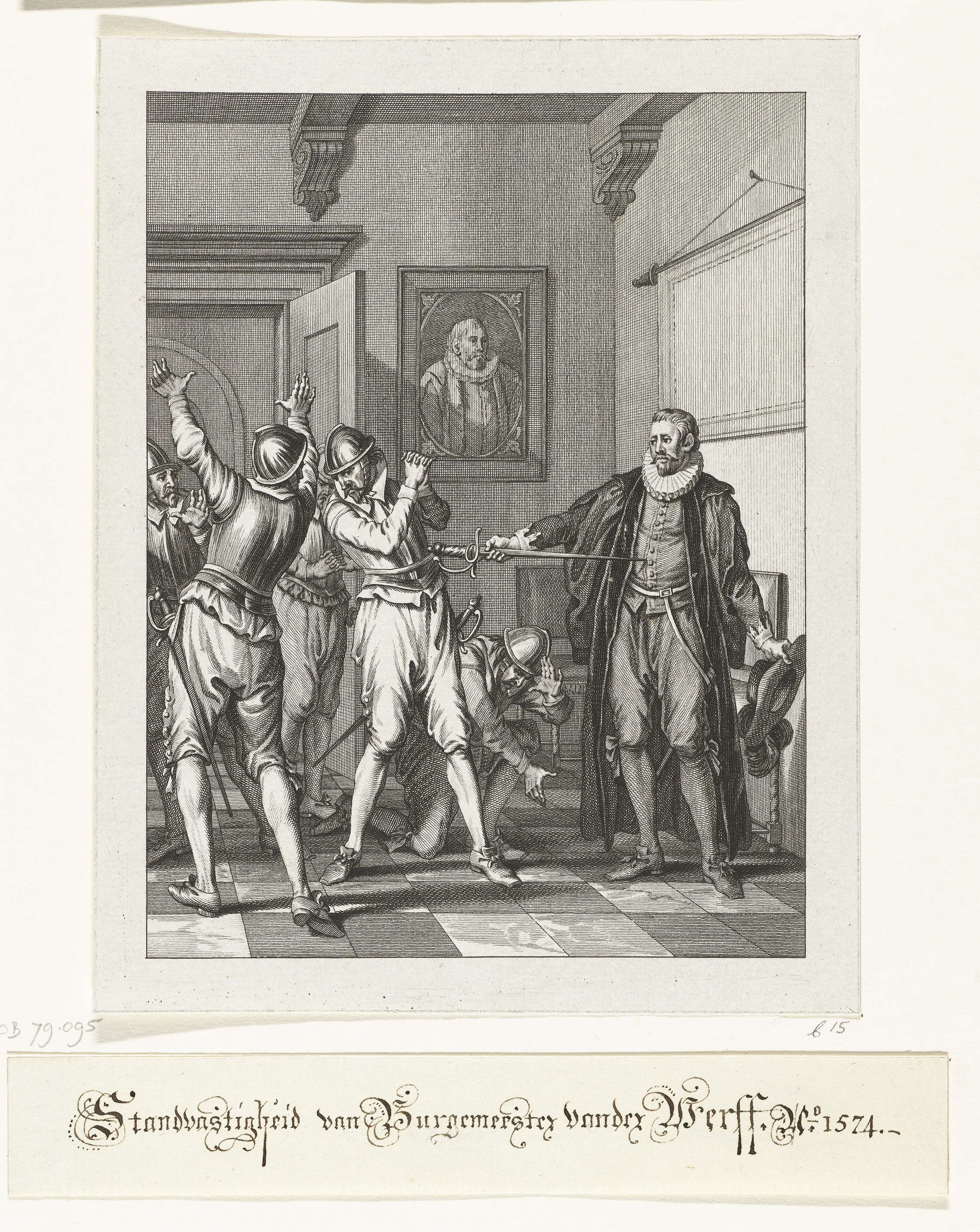 Standvastigheid van burgemeester van der Werff tijdens het beleg van Leiden, 1574. De burgemeester reikt soldaten het zwaard om hem te doden. Vijftiende zang.